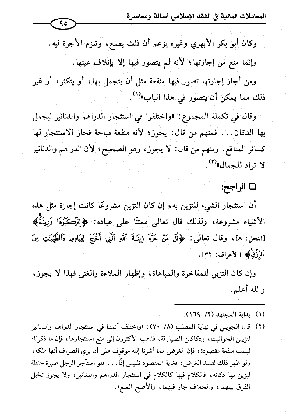 أن استئجار الشيء للتزين به، إن كان التزين مشروعًا كانت إجارة مثل هذه الأشياء مشروعة، ولذلك قال تعالى ممتنًّا على عباده: {لِتَرْكَبُوهَا وَزِينَةً} [النحل: ٨]، وقال تعالى:- {قُلْ مَنْ حَرَّمَ زِينَةَ اللَّهِ الَّتِي أَخْرَجَ لِعِبَادِهِ وَالطَّيِّبَاتِ مِنَ الرِّزْقِ} [الأعراف: ٣٢].