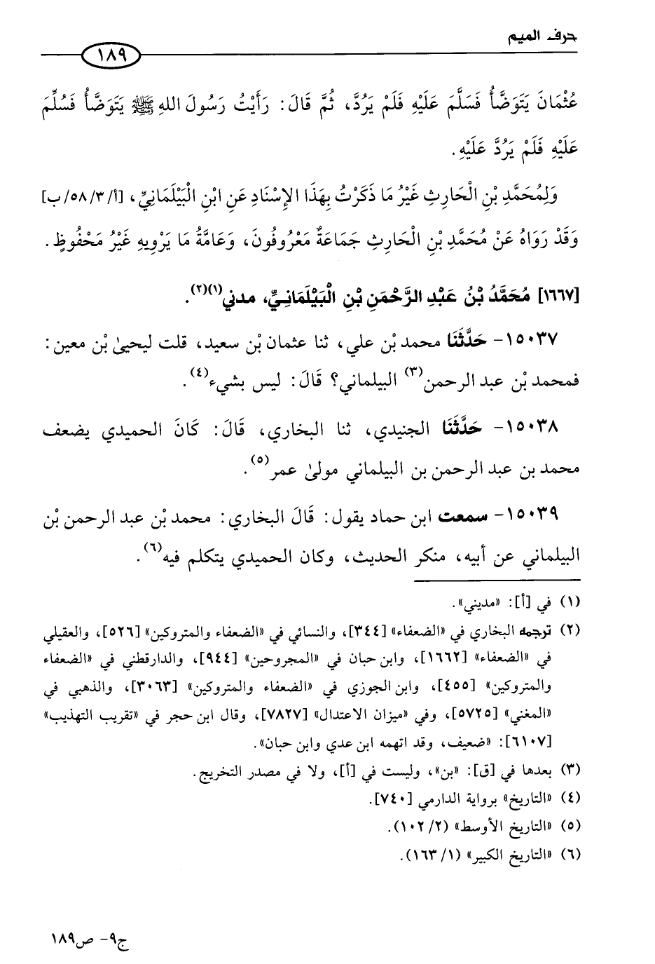 15038 - حَدثنا الجنيدي، حَدثنا البُخاري، قال: كان الحميدي يضعف مُحمد بن عَبد الرحمن بن البيلماني مولى عُمر.