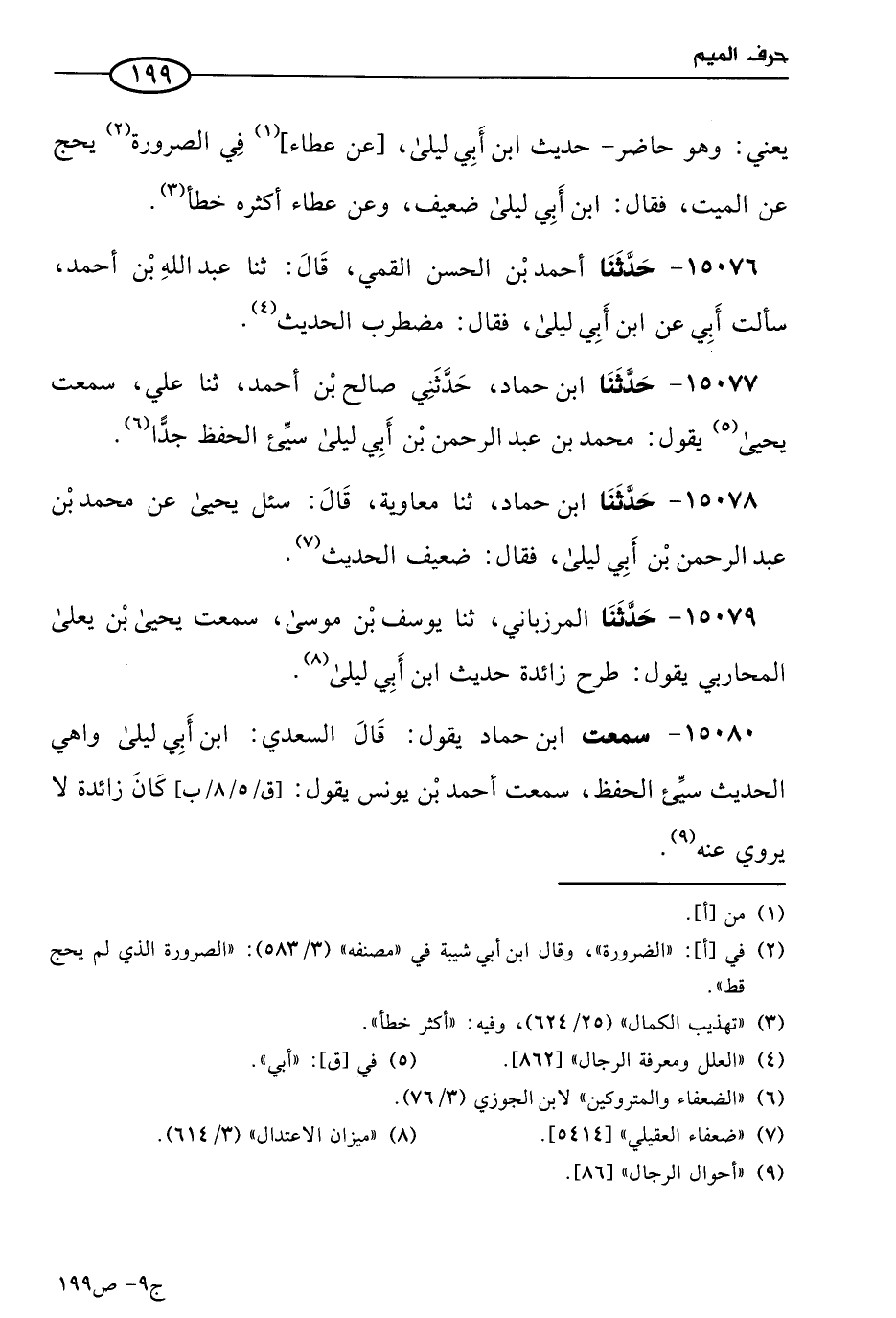 15077 - حَدثنا ابن حماد، حَدَّثني صالح بن أحمد، حَدثنا علي، سمعت يَحيى، يقول: مُحمد بن عَبد الرحمن بن أبي ليلى سيء الحفظ جدا.