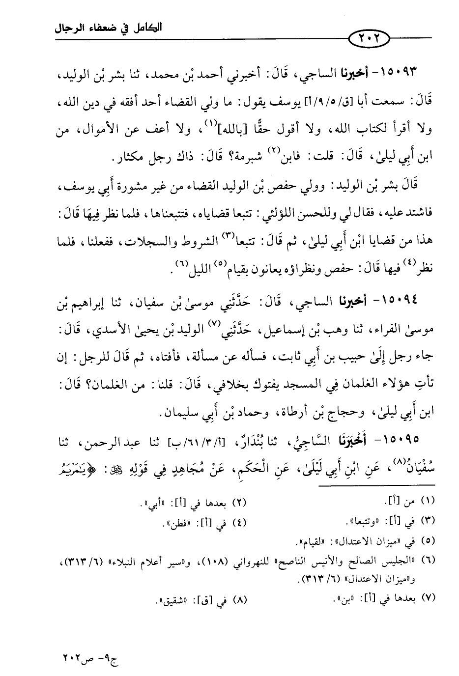 15093 - أخبرنا الساجي قال: أخبرني أحمد بن مُحمد، حَدثنا بشر بن الوليد، قال: سمعتُ أبا يوسف، يقول: ما ولي القضاء أحد أفقه في دين الله، ولا أقرأ لكتاب الله، ولا أقول حقا بالله، ولا أعف عن الأموال من ابن أبي ليلى، قال: قلت: فابن شبرمة؟ قال: ذاك رجل مكثار. قال بشر بن الوليد: وولي حفص بن غياث القضاء من غير مشورة أبي يوسف، فاشتد عليه، فقال لي وللحسن اللؤلئي: تتبعا قضاياه، فتتبعناها، فلما نظر فيها، قال: هذا من قضايا ابن أبي ليلى، ثم قال: تتبعا الشروط والسجلات ففعلنا، فلما نظر فيها، قال: حفص ونظراؤه يعانون بقيام الليل.