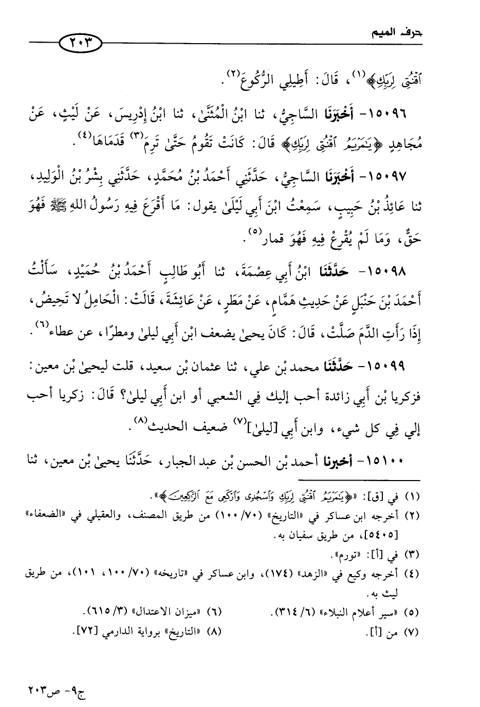 15096 - أخبرنا الساجي، حَدثنا ابن المثنى، حَدثنا ابن إدريس، عن لَيث، عن مجاهد؛ {يا مريم اقنتي لربك} قال: كانت تقوم حتى ترم قدماها.