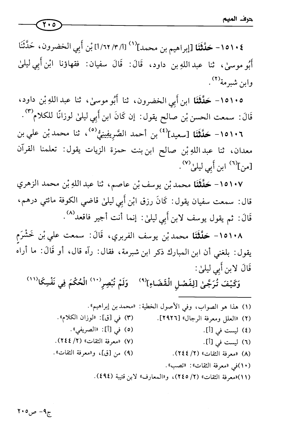 15104 - حَدثنا إبراهيم بن محمد بن أبي الخضرون، حَدثنا أَبو موسى، حَدثنا عَبد الله بن داود، قال: قال سفيان: فقهاؤنا ابن أبي ليلى، وابن شبرمة.