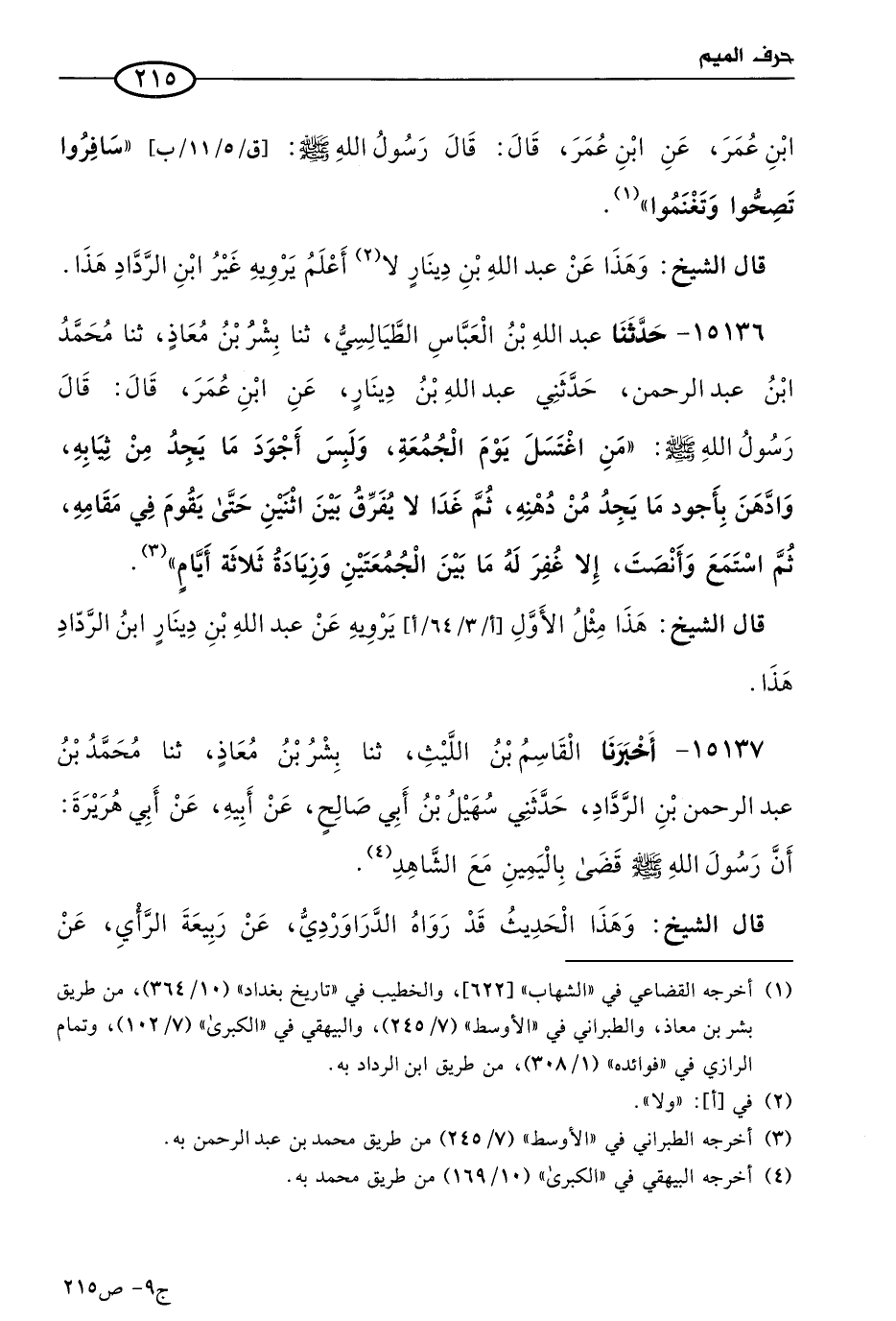 15136 - حَدثنا عَبد الله بن العباس الطيالسي، حَدثنا بشر بن معاذ، حَدثنا مُحمد بن عَبد الرحمن، حَدَّثني عَبد الله بن دينار، عن ابن عُمر، قال: قال رسول الله صَلى الله عَليه وسَلم: من اغتسل يوم الجمعة ولبس أجود ما يجد من ثيابه، وادَّهن بأجود ما يجد من دهنه، ثم غدا لا يفرق بين اثنين حتى يقوم في مقامه، ثم استمع وأنصت إلا غفر له ما بين الجمعتين، وزيادة ثلاثة أيام.