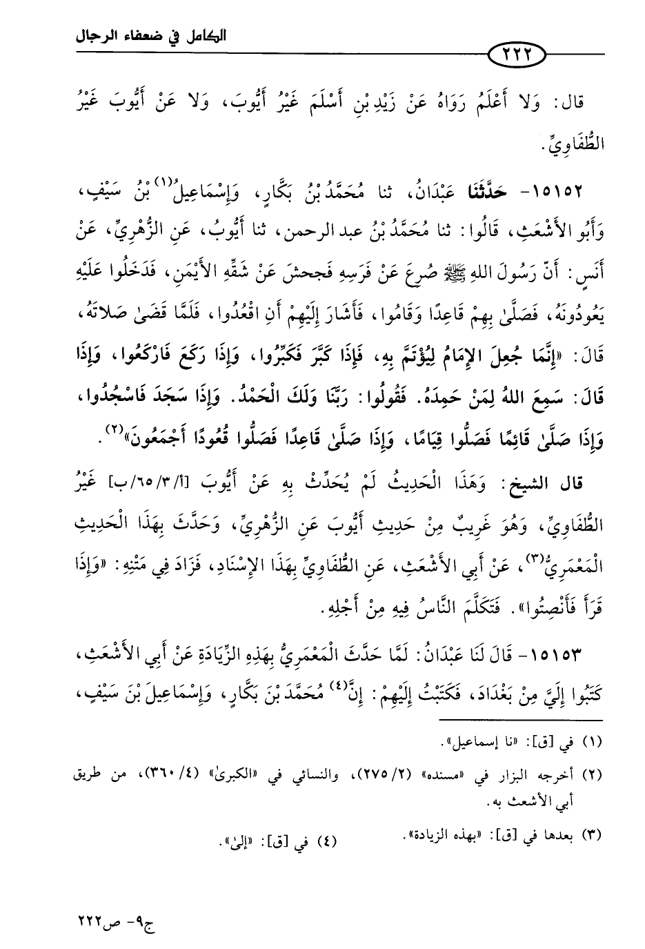 15153 - قال لنا عبدان: لما حدث المعمري بهذه الزيادة عن أبي الأشعث كتبوا إلي من بغداد، فكتبت إليهم: إن مُحمد بن بكار، وإسماعيل بن سيف، وأبا الأشعث، ثلاثتهم حدثونا عن الطفاوي، وليس فيه: فإذا قرأ فأنصتوا.