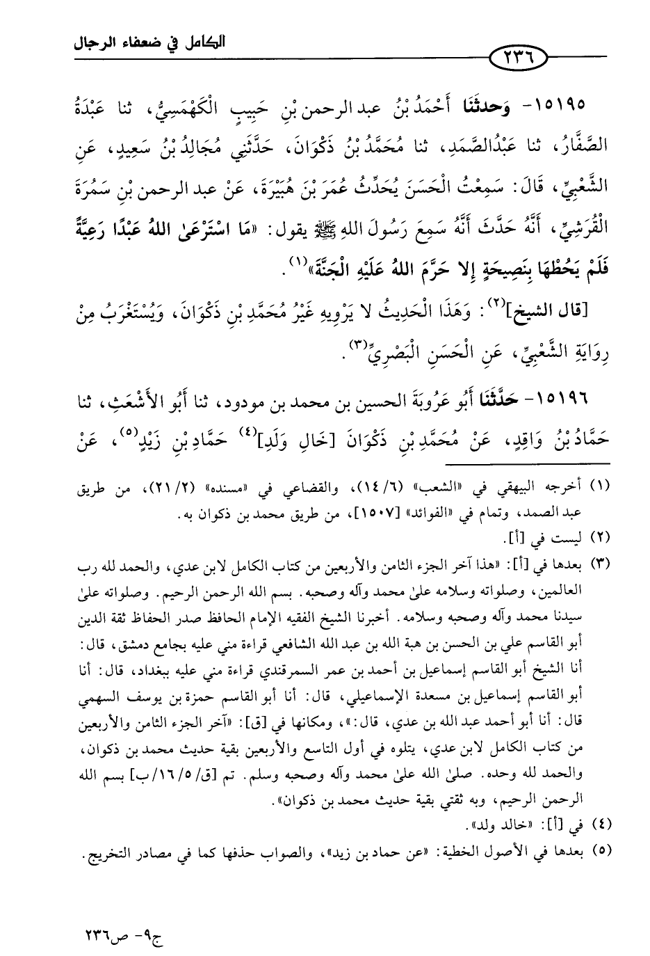 15195 - وحدثنا أحمد بن عَبد الرحمن بن حبيب الكهمسي، حَدثنا عبدة الصفار، حَدثنا عَبد الصمد، حَدثنا مُحمد بن ذكوان، حَدَّثني مجالد بن سعيد، عن الشعبي، قال: سمعتُ الحسن، يحدث عُمر بن هبيرة، عن عَبد الرحمن بن سمرة القرشي، أنه حدث، أنه سمع رسول الله صَلى الله عَليه وسَلم، يقول: ما استرعى الله عبدا رعية فلم يحطها بنصيحة، إلا حرم الله عليه الجنة.