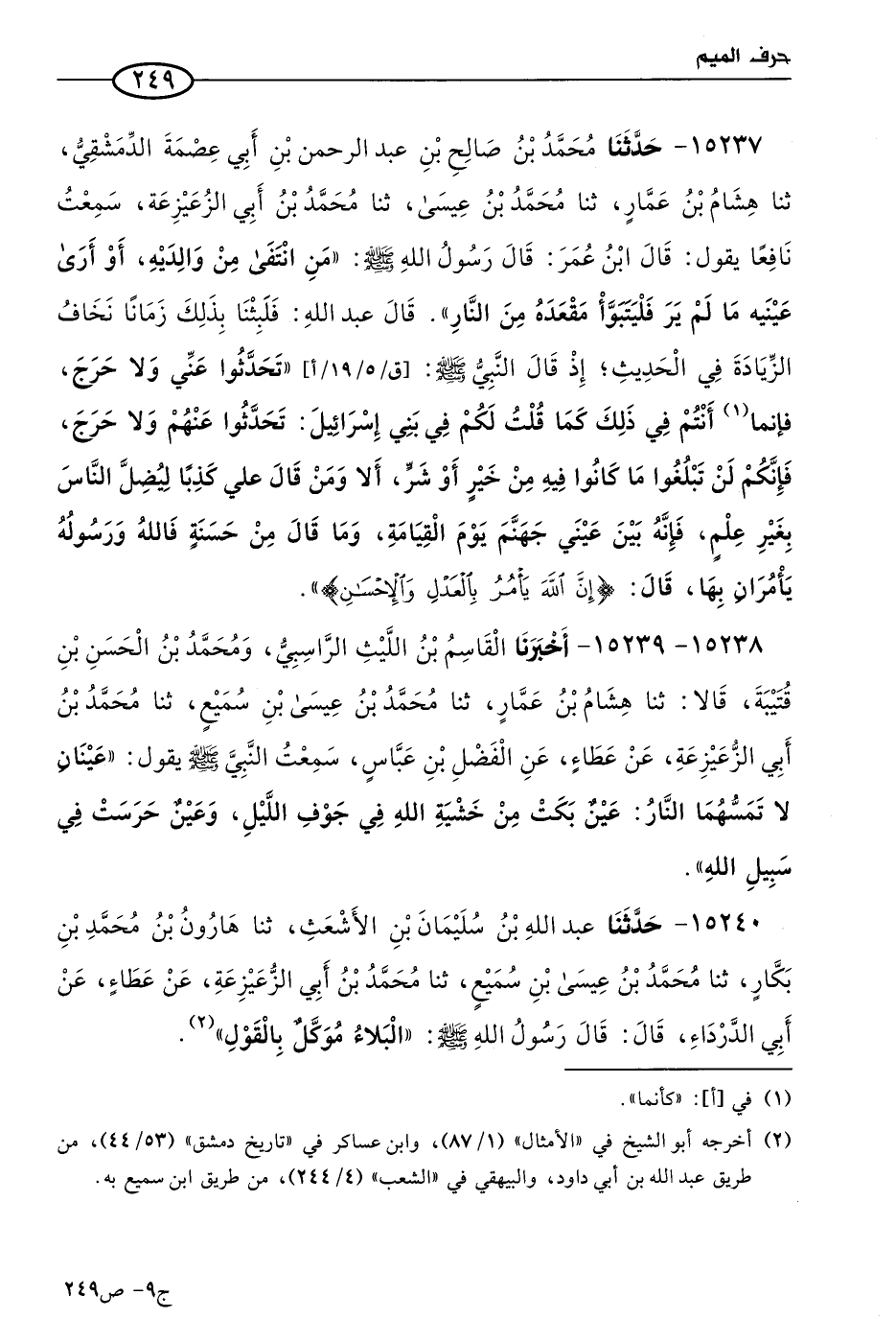 15238 - 15239 - أخبرنا القاسم بن الليث الرسعني (1)، ومُحمد بن الحسن بن قتيبة، قالا: حَدثنا هشام بن عمار، حَدثنا مُحمد بن عيسى بن سميع، حَدثنا مُحمد بن أبي الزعيزعة، عن عَطاء، عن الفضل بن عباس، سمعت النبي صَلى الله عَليه وسلم، يقول: عينان لا تمسهما النار: عين بكت من خشية الله في جوف الليل، وعين حرست في سبيل الله.