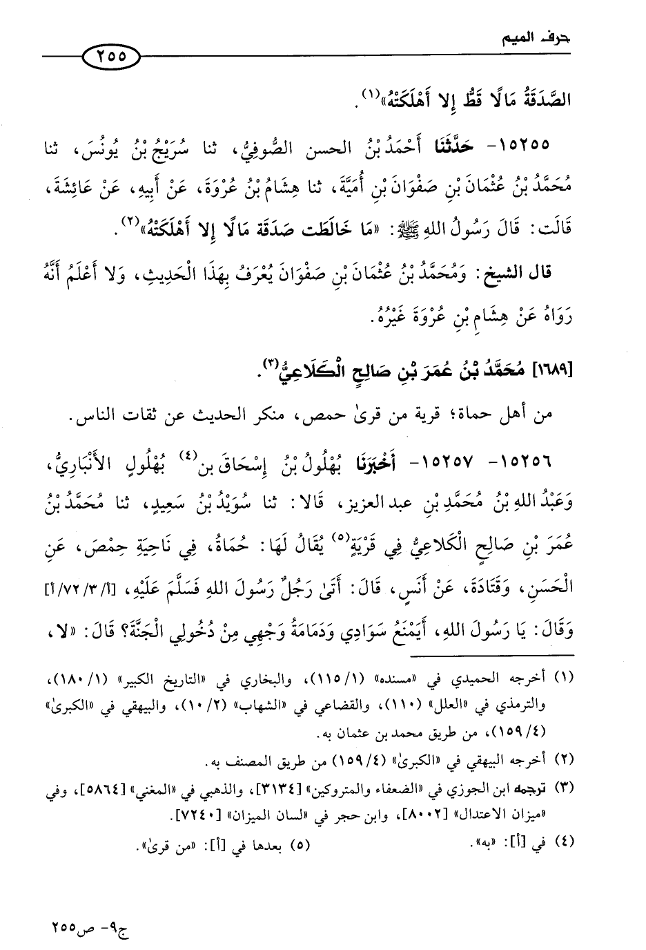 15255 - حَدثنا أحمد بن الحسن الصُّوفي، حَدثنا سريج بن يُونُس، حَدثنا مُحمد بن عثمان بن صفوان بن أمية، حَدثنا هشام بن عروة، عن أبيه، عن عائشة، قالت: قال رسول الله صَلى الله عَليه وسَلم: ما خالطت الصدقة مالا إلا أهلكته.