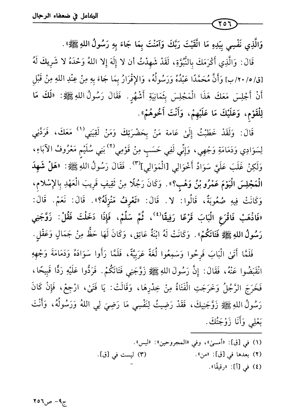 قال: ولقد خطبت إلى عامة من بحضرتك، ومن لقيني معك، فردني لسوادي، ودمامة وجهي، وإني لفي حسب من قومي بني سليم معروف الآباء. ولكن غلب علي سواد أخوالي الموالي، فقال رسول الله صَلى الله عَليه وسَلم: هل شهد المجلس اليوم عَمرو بن وهب؟ وكان رجلاً من ثقيف قريب العهد بالإسلام، وكانت فيه صعوبة، قالوا: لا، قال: تعرف منزله؟ قال: نَعم، قال: فاذهب فاقرع الباب قرعا رفيقا، ثم سلم، فإذا دخلت، فقل: زوجني رسول الله صَلى الله عَليه وسَلم فتاتكم، وكانت له ابنة عاتق، وكان لها حظ من جمال وعقل، فلما أتى الباب فرحوا وسمعوا لغة عربية، فلما رأوا سواده ودمامة وجهه انقبضوا عنه، فقال: إن رسول الله صَلى الله عَليه وسَلم زوجني فتاتكم، فردوا عليه ردا قبيحا، فخرج الرجل وخرجت الفتاة من خدرها، وقالت: يا فتى، ارجع، فإن كان رسول الله صَلى الله عَليه وسَلم زوجنيك، فقد رضيت لنفسي ما رضي لي الله ورسوله، وأنت بعلي وأنا زوجتك،