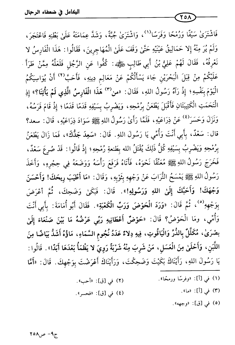 إذ رآه رسول الله صَلى الله عَليه وسَلم، فقال: من هذا الفارس الذي لم يأتنا إذ التحمت الكتيبتان، فأقبل يطعن برمحه ويضرب بسيفه قدما قدما، إذ قام فرسه ونزل وحسر عن ذراعيه، فلما رأى رسول الله صَلى الله عَليه وسَلم سواد ذراعيه، قال: سعد؟ قال: سعد، بأبي أنت وأمي يا رسول الله، قال: سعد جدك، فما زال يطعن برمحه، ويضرب بسيفه، كل ذلك يقتل الله بطعنة رمحه، إذ قالوا: قد صرع سعد، فخرج رسول الله صَلى الله عَليه وسَلم معنقا نحوه، فأتاه فرفع رأسه ووضعه في حجره، وأخذ رسول الله صَلى الله عَليه وسَلم يمسح التراب عن وجهه بثوبه، وقال: ما أطيب ريحك، وأحسن وجهك، وأحبك إلى الله ورسوله، قال: فبكى وضحك، ثم أعرض بوجهه، ثم قال: ورد الحوض ورب الكعبة. فقال أَبو أمامة: بأبي أنت وأمي، ما الحوض؟ قال: حوض أعطانيه ربي، عرضه ما بين صنعاء إلى بصرى، مكلل بالدر والياقوت، فيه دلاء عدد نجوم السماء، ماؤه أشد بياضا من اللبن، وأحلى من العسل، من شرب منه شربة روي لا يظمأ بعدها أبدا، قالوا: يا رسول الله، رأيناك بكيت وضحكت، ورأيناك أعرضت بوجهك، قال: أما بكائي: فبكيت شوقا إلى سعد، وأما ضحكي: ففرحت له لمنزلته من الله وكرامته عليه، وأما إعراضي: فإني رأيت أزواجه من الحور العين، يبادرن كاشفات سوقهن باديات خلاخيلهن، فأعرضت عنهن حياء، فأمر بسيفه، ورمحه، وفرسه، وما كان له، فقال: اذهبوا به إلى زوجته، فقولوا لهم: إن الله قد زوجه خيرًا من فتاتكم، وهذا ميراثه، والذي نفس مُحمد بيده، إني لأذب عن حوضي، كما يذب البعير الأجرب عن الإبل لا يخالطها، إنه لا يرد علي في حوضي إلا التقي النقي، الذين يعطون ما عليهم في يسر، ولا يعطون ما لهم في عسر.