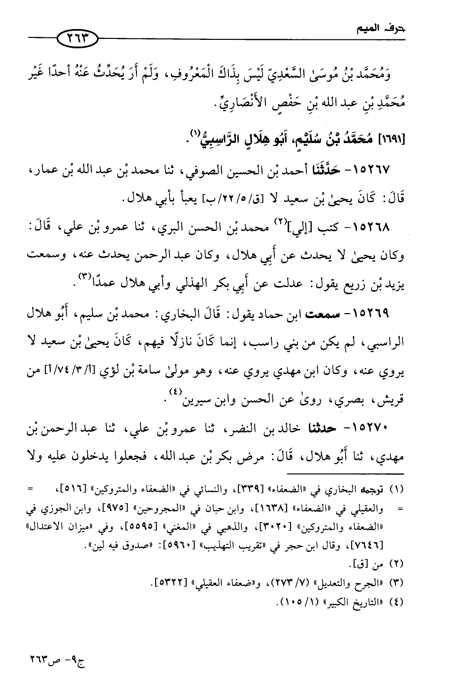 15269 - سمعتُ ابن حماد، يقول: قال البُخاري: مُحمد بن سليم أَبو هلال الراسبي، لم يكن من بني راسب، إنما كان نازلا فيهم، كان يَحيى بن سعيد لا يروي عنه، وكان ابن مهدي يروي عنه، وهو مولى سامة بن لؤي من قريش بصري، روي عن الحسن، وابن سِيرين.