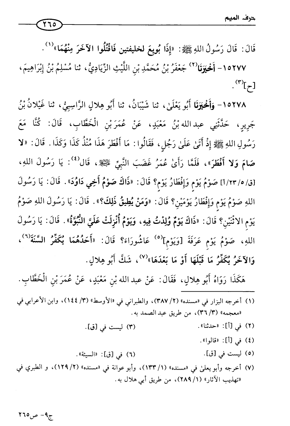 15278 - وأخبرنا أَبو يَعلَى، حَدثنا شيبان، قالا (1): حَدثنا أَبو هلال الراسبي، حَدثنا غيلان بن جرير، حَدَّثني عَبد الله بن معبد، عن عُمر بن الخطاب، قال: كُنا مع رسول الله صَلى الله عَليه وسَلم إذ أتى على رجل، فقالوا: ما أفطر هذا منذ كذا وكذا، قال: لا صام ولا أفطر، فلما رأى عُمر غضب النبي عليه السلام، قال: يا رسول الله، صوم يوم، وإفطار يوم؟ قال: ذاك صوم أخي داود، قال: يا رسول الله، صوم يوم، وإفطار يومين؟ قال: ومن يطيق ذلك؟ قال: يا رسول الله، صوم يوم الاثنين، قال: ذاك يوم ولدت فيه، ويوم أنزلت علي النبوة، قال: يا رسول الله، صوم يوم عرفة، ويوم عاشوراء؟ قال: أحدهما يكفر السنة، والآخر يكفر ما قبلها، أو ما بعدها. شك أَبو هلال.