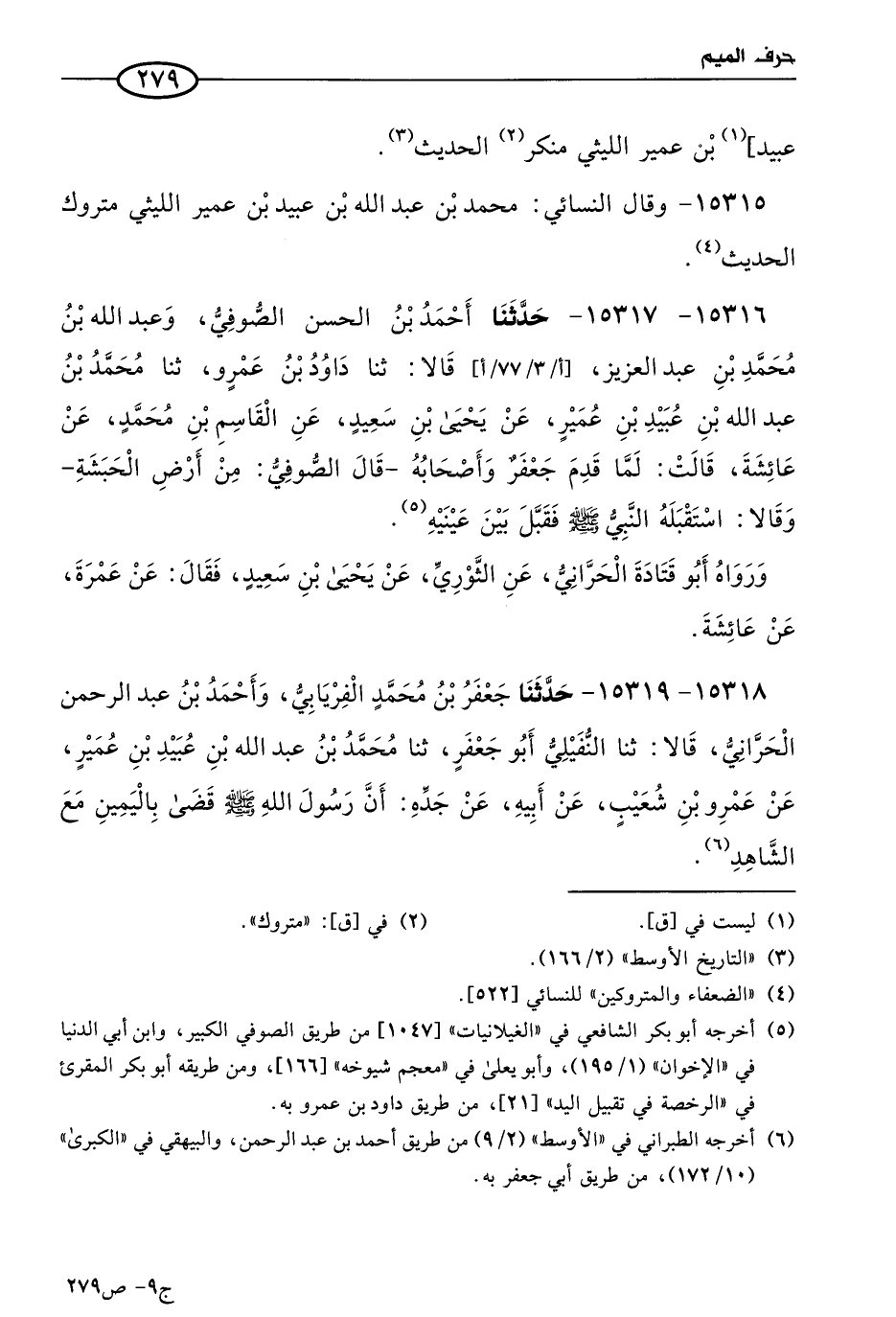 15318 - 15319 - حَدثنا جعفر بن مُحمد الفريابي، وأحمد بن عَبد الرحمن الحراني، قالا: حَدثنا النفيلي أَبو جعفر، حَدثنا مُحمد بن عَبد الله بن عُبيد بن عُمَير، عن عَمرو بن شُعَيب، عن أبيه، عن جَدِّهِ؛ أن رسول الله صَلى الله عَليه وسَلم قضى باليمين مع الشاهد. - قال الشيخ: وهذا يرويه عن عَمرو بن شُعَيب: مُحمد بن عَبد الله بن عُبيد بن عُمَير، ورواه مطرف الصنعاني، عن ابن جُرَيج، عن عَمرو بن شُعَيب، ويقال: إن أحمد بن حنبل سمع هذا من النفيلي.