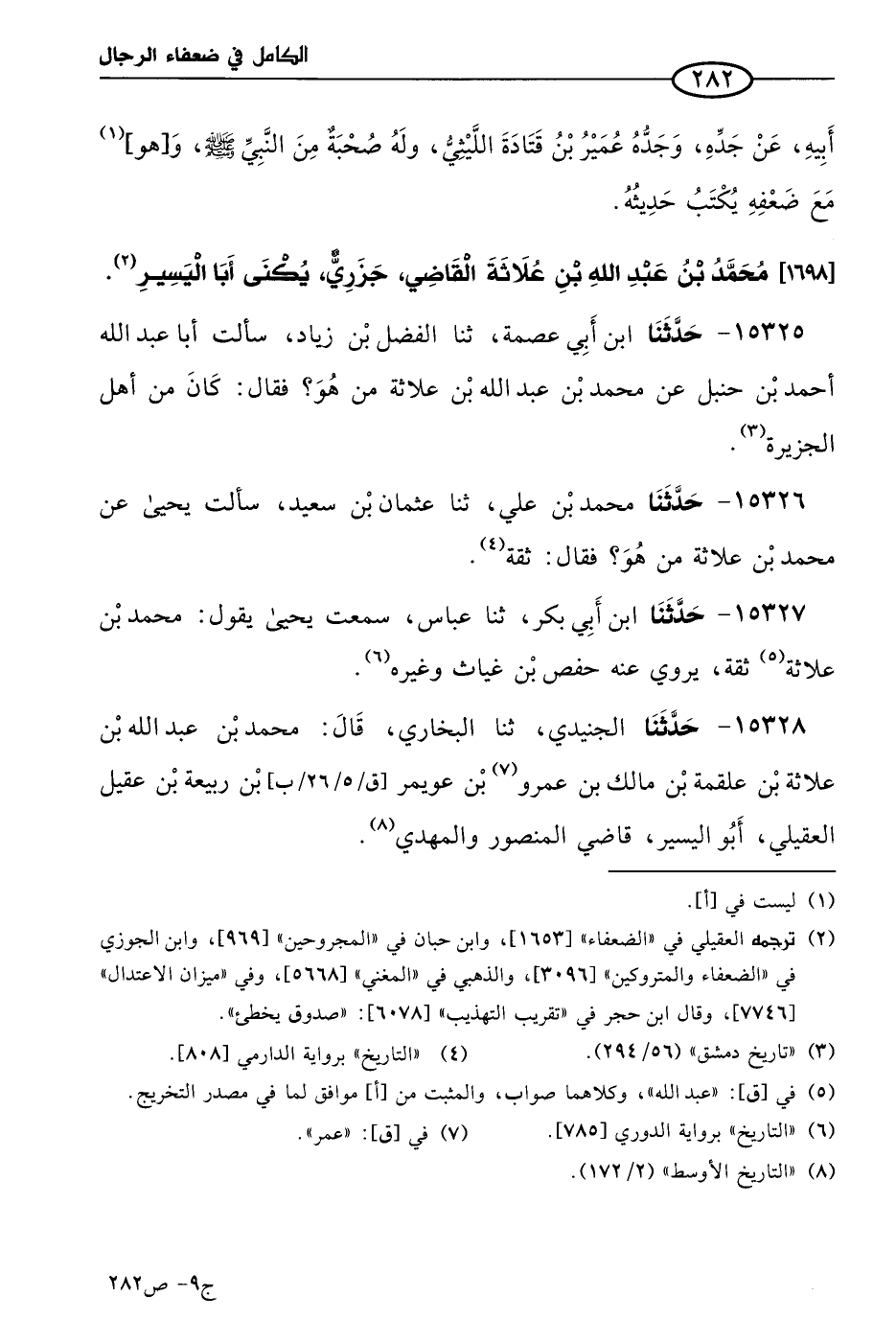 15328 - حَدثنا الجنيدي، حَدثنا البُخاري، قال: مُحمد بن عَبد الله بن علاثة بن علقمة بن مالك بن عَمرو بن عويمر بن ربيعة بن عقيل العقيلي، أَبو اليسير، قاضي المنصور والمهدي.