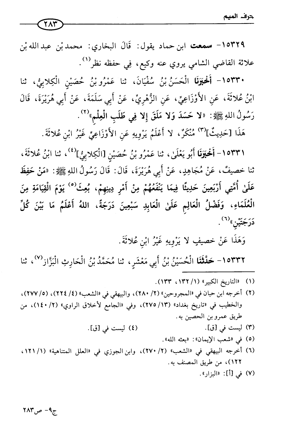 15330 - أخبرنا الحسن بن سفيان، حَدثنا عَمرو بن حصين الكلابي، حَدثنا ابن علاثة، عن الأَوزاعي، عن الزُّهْري، عن أبي سلمة، عن أبي هريرة، قال رسول الله صَلى الله عَليه وسَلم: لا حسد ولا ملق، إلا في طلب العلم.