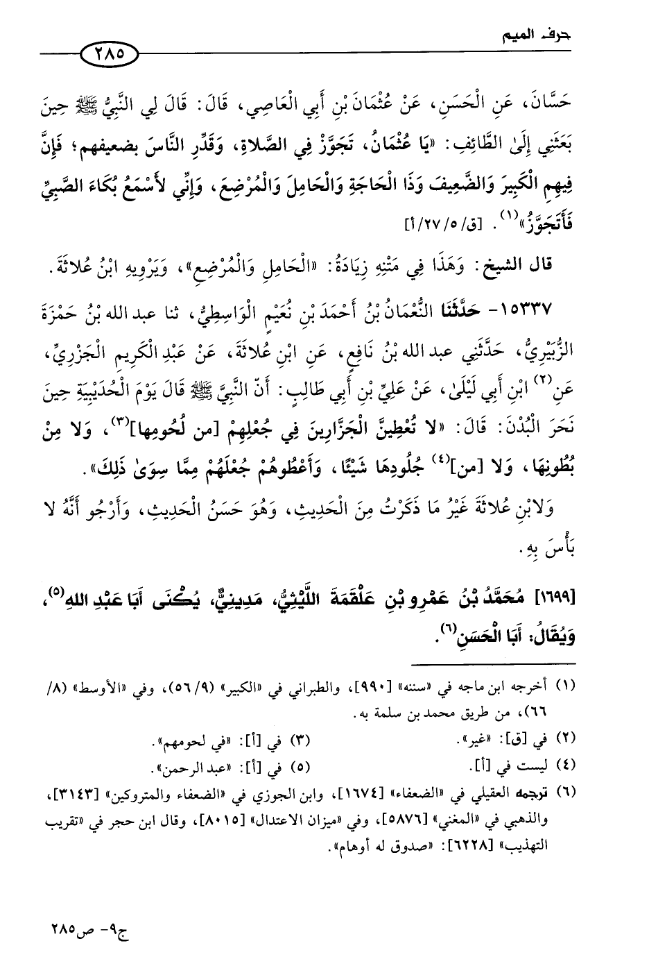 15337 - حَدثنا النعمان بن أحمد بن نعيم الواسطي، حَدثنا عَبد الله بن حمزة الزبيري، حَدَّثني عَبد الله بن نافع، عن ابن علاثة، عن عَبد الكريم الجزري، عن ابن أبي ليلى، عن علي بن أبي طالب؛ أن النبي صَلى الله عَليه وسَلم قال يوم الحديبية حين نحر البدن، قال: لا تعطين الجزارين في جُعلهم من لحومها، ولا من بطونها، ولا من جلودها شيئا، وأعطوهم جُعلهم مما سوى ذلك.