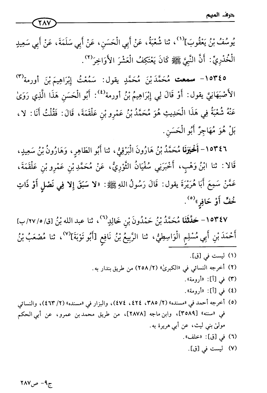 15346 - أخبرنا مُحمد بن هارون البرقي، حَدثنا أَبو الطاهر، وهارون بن سعيد، قالا: حَدثنا ابن وهب، أخبرني سفيان الثَّوري، عن مُحمد بن عَمرو بن علقمة، عَمَّن سمع أبا هريرة، يقول: قال رسول الله صَلى الله عَليه وسلم: لا سبق إلا في نصل، أو ذات خف، أو حافر.
