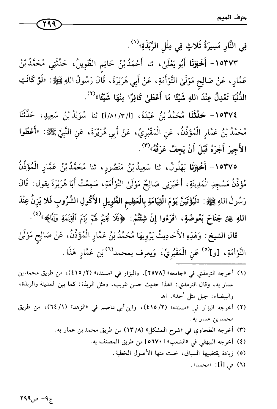 قال الشيخ: وهذه الأحاديث يرويها مُحمد بن عمار المؤذن، عن صالح مولى التوأمة، وعن المقبري، وتُعرف (1) بمحمد بن عمار هذا.