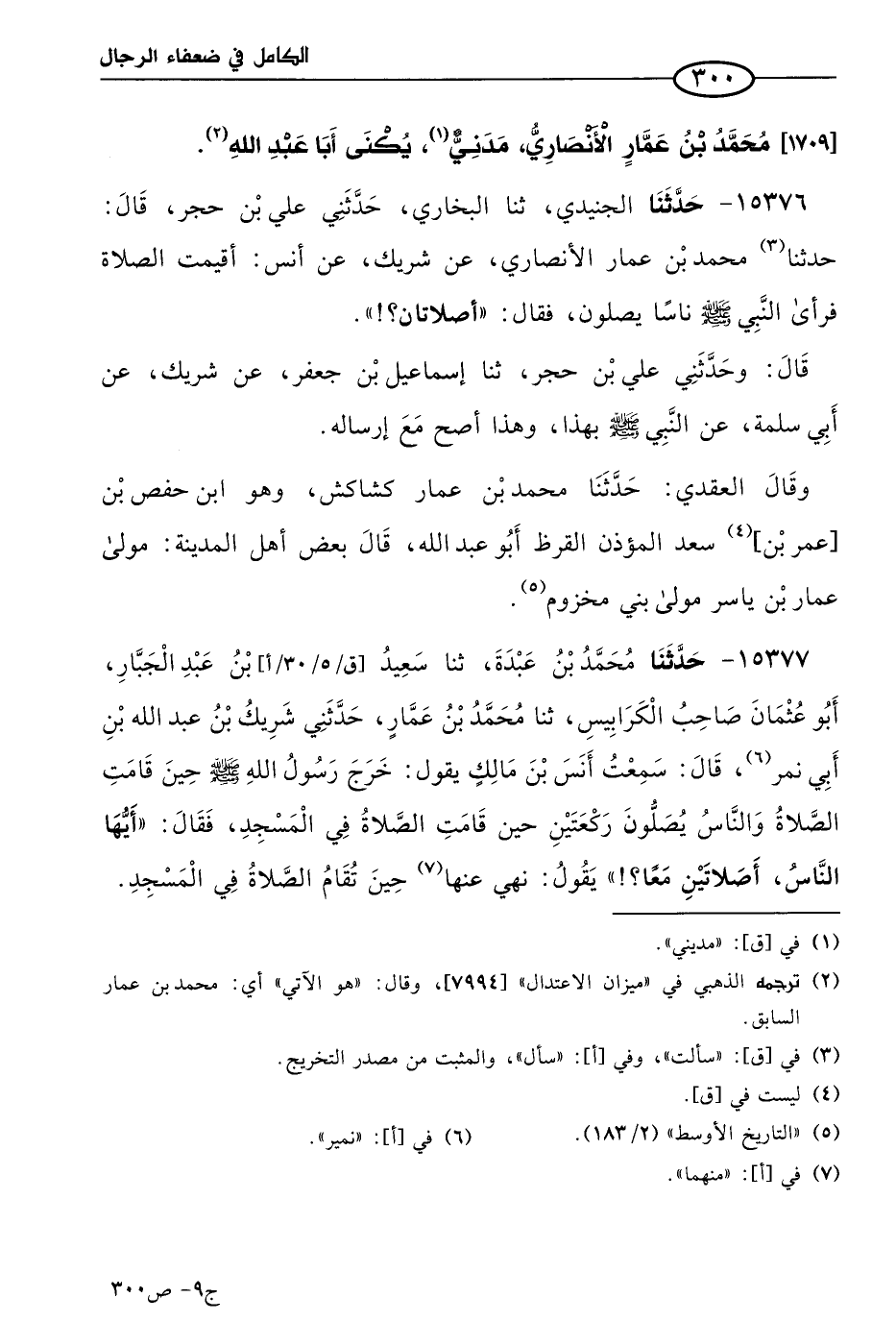 15376 - حَدثنا الجنيدي، حَدثنا البُخاري، حَدَّثني علي بن حجر، قال: حدثنا مُحمد بن عمار الأنصاري عن شَريك، عن أَنَس؛ أقيمت الصلاة، فرأى النبي صَلى الله عَليه وسلم ناسا يصلون فقال: أصلاتان؟ قال: وحدثني علي بن حجر، حَدثنا إسماعيل بن جعفر، عن شَريك، عن أبي سلمة، عن النبي صَلى الله عَليه وسلم، بهذا، وهذا أصح مع إرساله. وقال العقدي: حَدثنا مُحمد بن عمار، كشاكش، وهو ابن حفص بن عُمر بن سعد، المؤذن القرظ أَبو عَبد الله، قال بعض أهل المدينة: مولى عمار بن ياسر، مولى بني مخزوم.