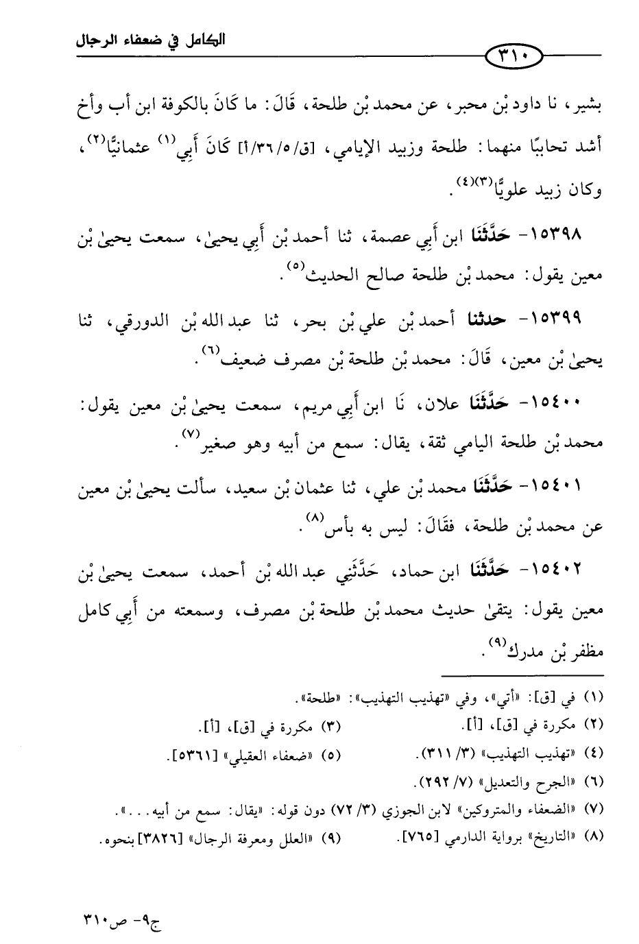 15402 - حَدثنا ابن حماد، حَدَّثني عَبد الله بن أحمد، سمعت يَحيى بن مَعين يقول: يُتَّقَى حديث مُحمد بن طلحة بن مصرف، وسمعته من أبي كامل مظفر بن مدرك.