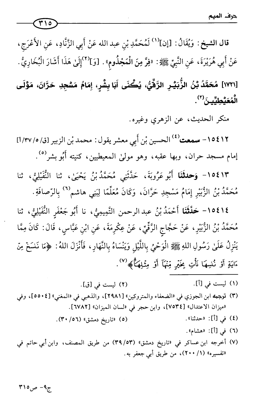 [1721] مُحمد بن الزبير الرقي، يُكْنَى أبا بشر، إمام مسجد حران، مولى المعيطيين.