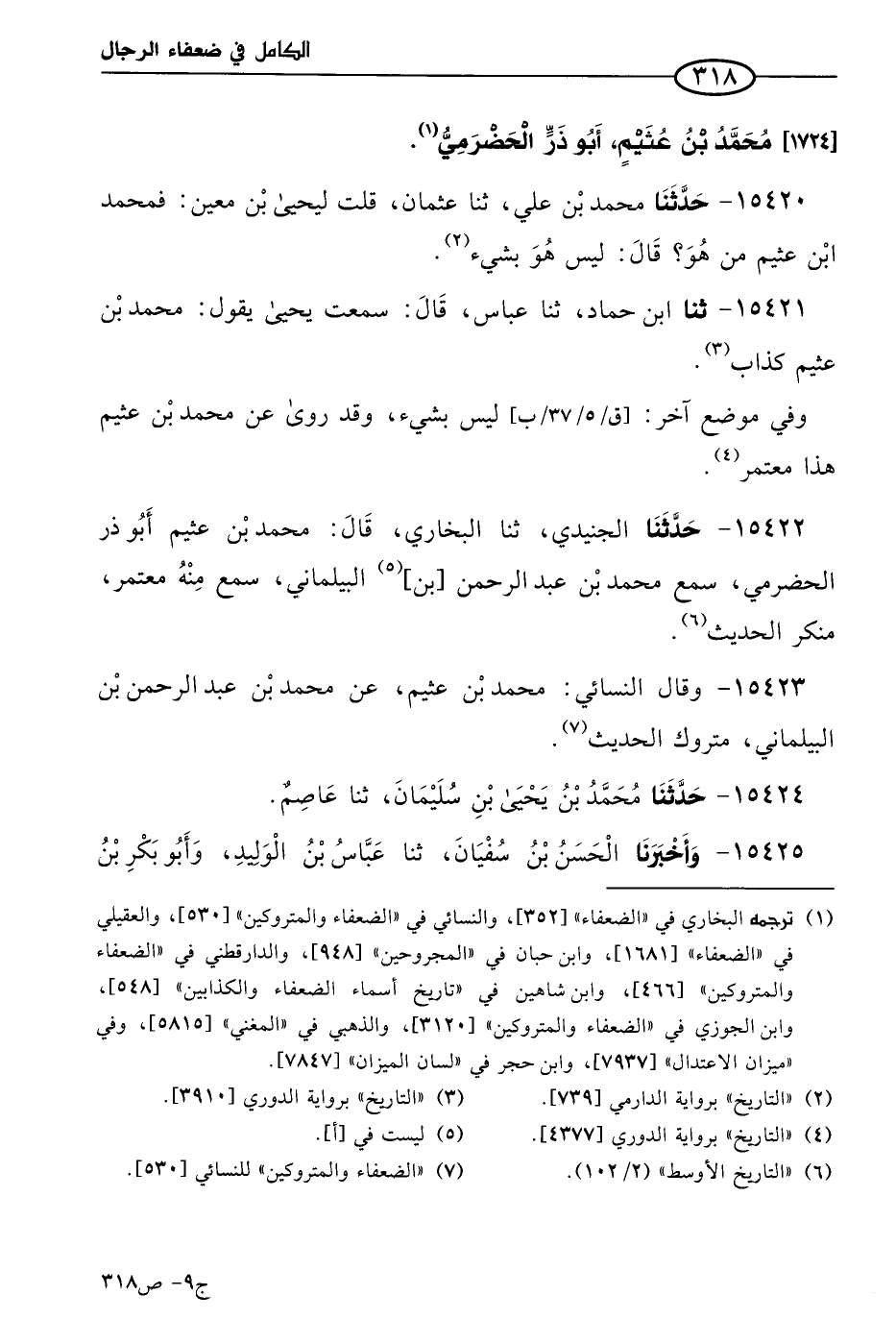 15421 - حَدثنا ابن حماد، حَدثنا عباس، قال: سمعتُ يَحيى، يقول: مُحمد بن عثيم كذاب.