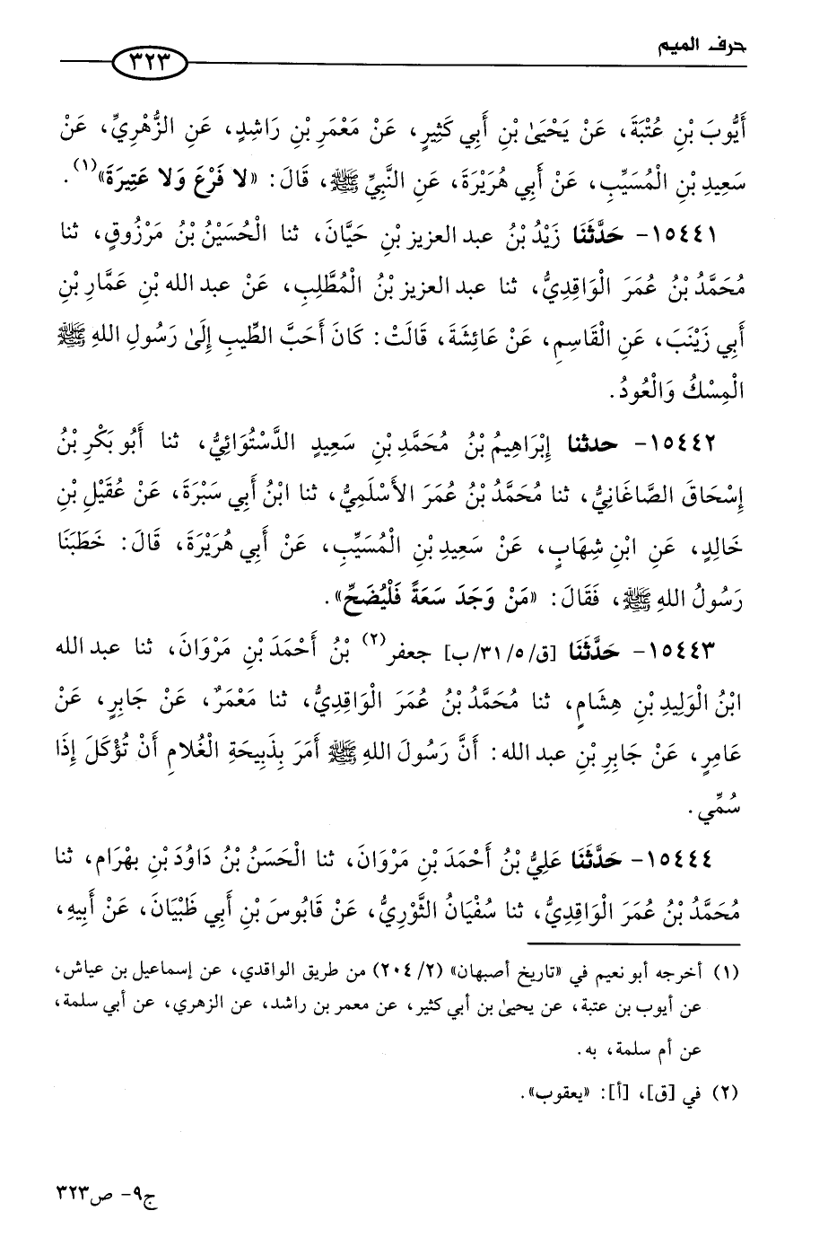 15443 - حَدثنا جعفر بن أحمد بن مروان، حَدثنا عَبد الله بن الوليد بن هشام، حَدثنا مُحمد بن عُمر الواقدي، حَدثنا معمر، عن جابر، عن عامر، عن جابر بن عَبد الله؛ أَن رسُول الله صَلى الله عَليه وسلم أمر بذبيحة الغلام أن تؤكل إذا سُمي.