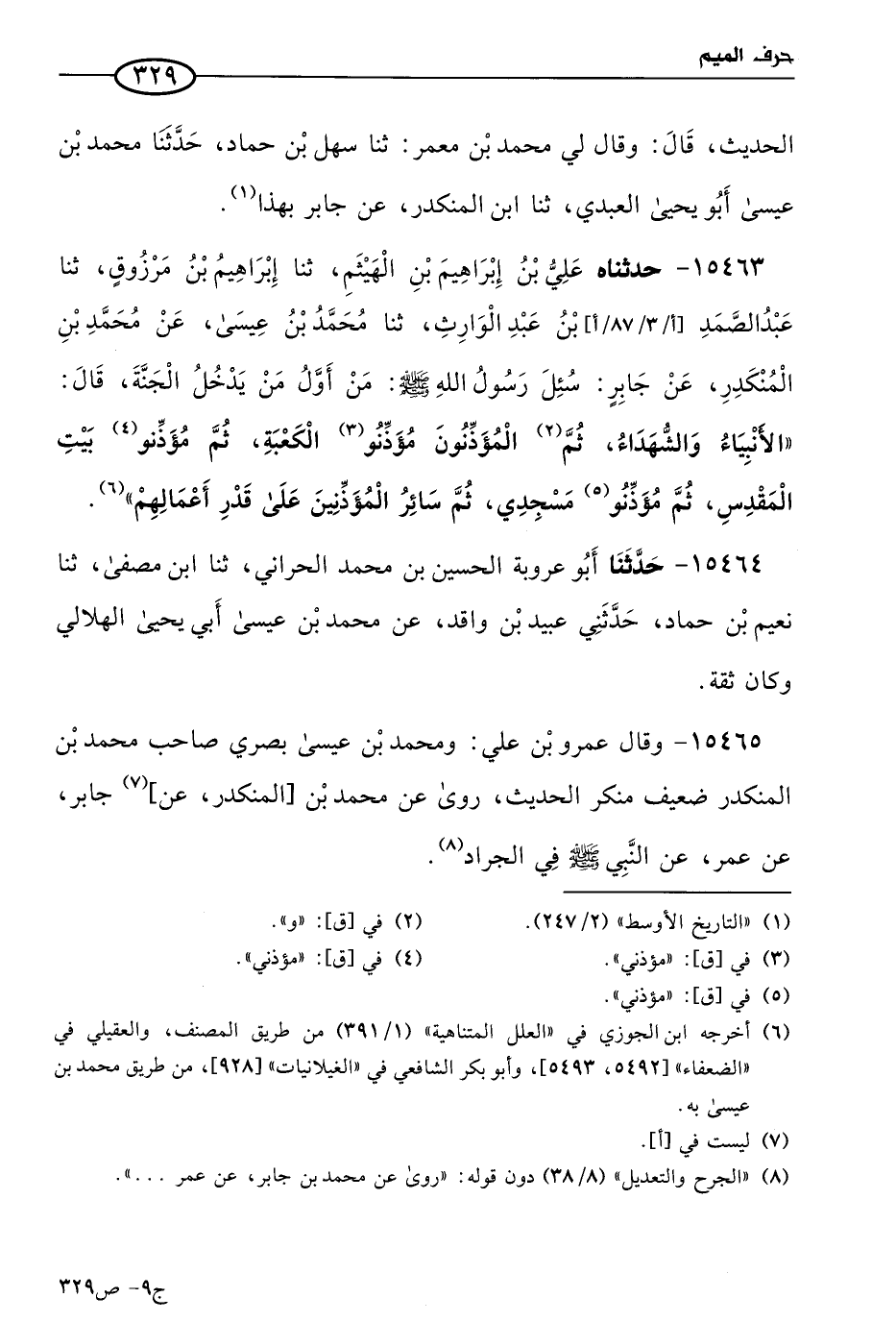 15463 - حَدثناه علي بن إبراهيم بن الهيثم، قال: حَدثنا إبراهيم بن مرزوق، حَدثنا عَبد الصمد بن عَبد الوارث، حَدثنا مُحمد بن عيسى، عن مُحمد بن المنكدر، عن جابر؛ سئل رسول الله صَلى الله عَليه وسَلم: من أول من يدخل الجنة؟ قال: الأنبياء والشهداء، ثم المؤذنون، مؤذنو الكعبة، ثم مؤذنو بيت المقدس، ثم مؤذنو مسجدي، ثم سائر المؤذنين، على قدر أعمالهم.