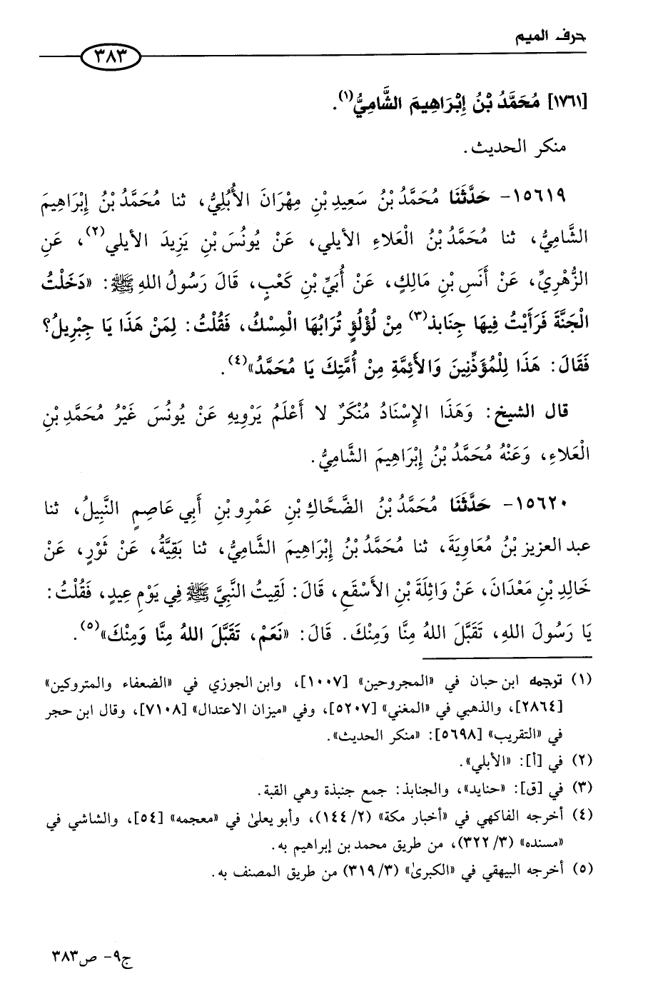 قال الشيخ: وهذا الإسناد منكر، لا أعلم يرويه عن يُونُس غير مُحمد بن العلاء، وعنه مُحمد بن إبراهيم الشامي.