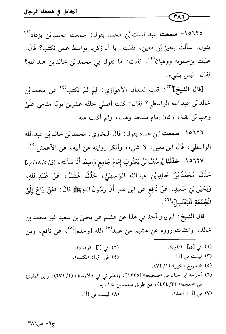 15625 - سمعت عَبد الملك بن مُحمد، يقول: سَمعتُ مُحمد بن يزداد، يقولُ: سَألتُ يَحيى بن مَعين، فقلتُ: يا أبا زكريا، بواسط، عمن نكتب؟ قال: عليك بزحمويه، وهناد، فقلت: ما تقول في مُحمد بن خالد بن عَبد الله؟ فقال: ليس بشَيءٍ.