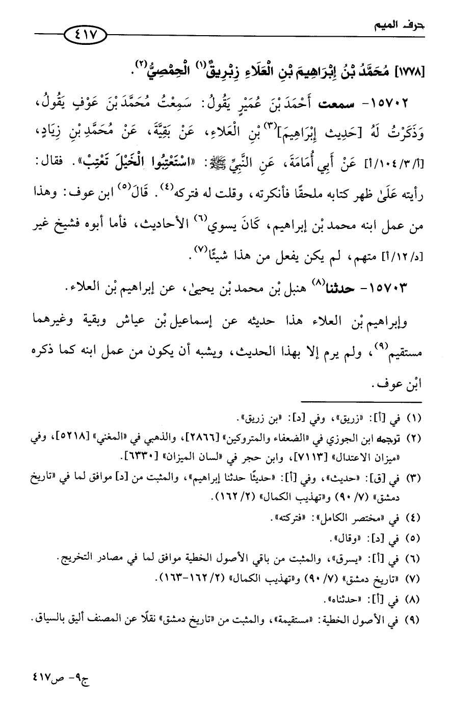 15702 - سمعت أحمد بن عُمَير، يقول: سَمعتُ مُحمد بن عوف، يقول: وذكرت له حديث إبراهيم بن العلاء، عن بَقِية، عن مُحمد بن زياد، عن أبي أُمامة، عن النبي صَلى الله عَليه وسلم؛ استعتبوا الخيل تعتب؟ فقال: رأيته على ظهر كتابه ملحقا، فأنكرته، وقلت له فتركه.
