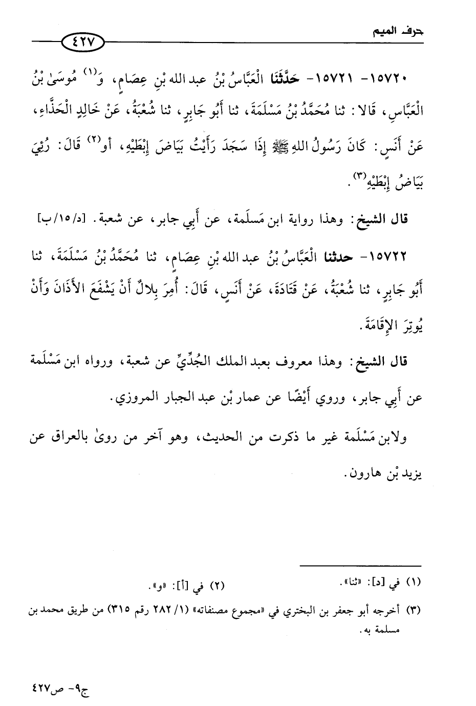 15720 - 15721 - حَدثنا العباس بن عَبد الله بن عصام، وموسى بن العباس، قالا: حَدثنا مُحمد بن مسلمة، حَدثنا أَبو جابر، حَدثنا شُعبَة، عن خالد الحذاء، عن أَنَس؛ كان رسول الله صَلى الله عَليه وسَلم إذا سجد رأيت بياض إبطيه، أو قال: رئي بياض إبطيه.