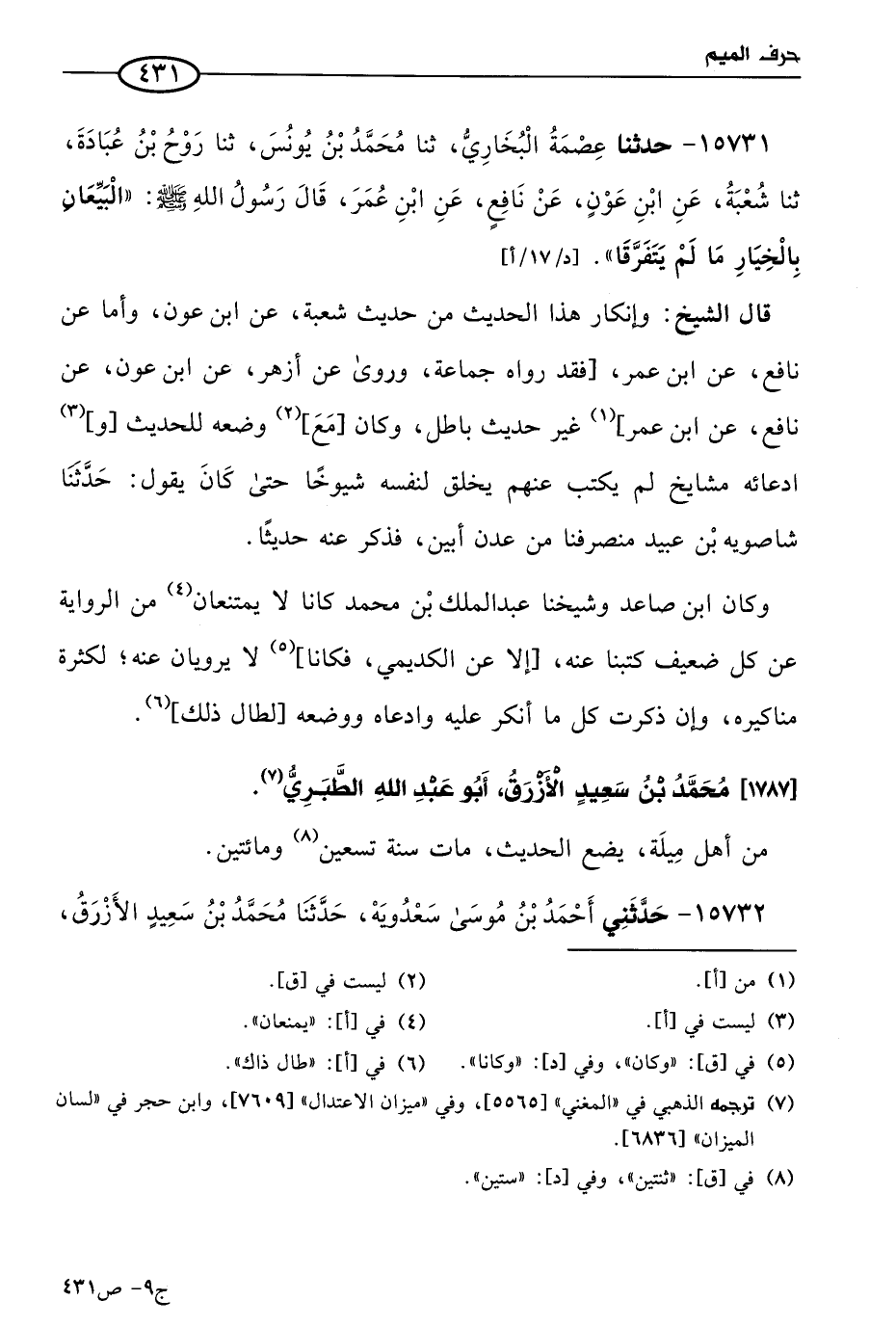 15731 - حَدثنا عصمة البُخاري، حَدثنا مُحمد بن يُونُس، حَدثنا روح بن عبادة، حَدثنا شُعبَة، عن ابن عون، عن نافع، عن ابن عُمر، قال رسول الله صَلى الله عَليه وسلم: البيعان بالخيار ما لم يتفرقا.