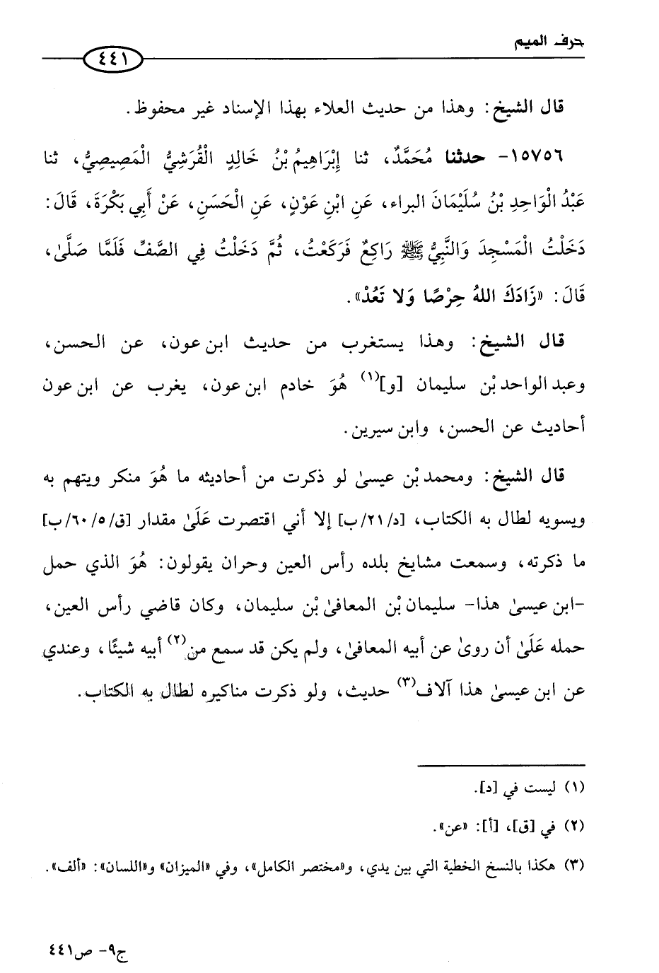 15756 - حَدثنا مُحمد، حَدثنا إبراهيم بن خالد القرشي المصيصي، حَدثنا عَبد الواحد بن سليمان البزاز، عن ابن عون، عن الحسن، عن أبي بكرة، قال: دخلت المسجد والنبي صَلى الله عَليه وسلم راكع فركعت، ثم دخلت في الصف فلما صلى، قال: زادك الله حرصا، ولا تعد.