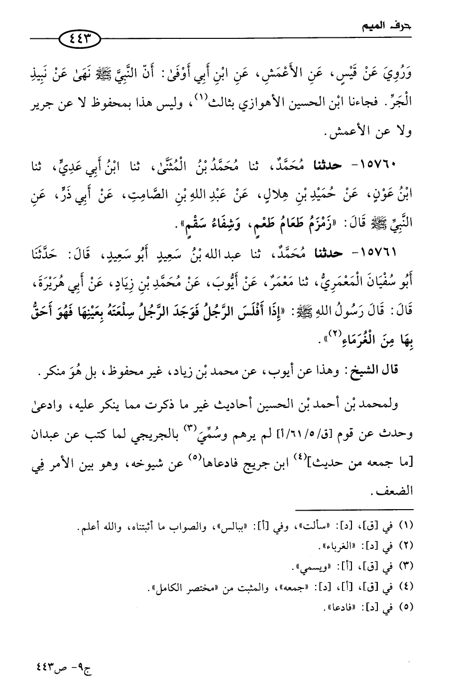 15760 - حَدثنا مُحمد، حَدثنا مُحمد بن المثنى، حَدثنا ابن أبي عدي، حَدثنا ابن عون، عن حميد بن هلال، عن عَبد الله بن الصامت، عن أَبِي ذَرٍّ، عن النبي صَلى الله عَليه وسَلم، قال: زمزم طعام طعم، وشفاء سقم.