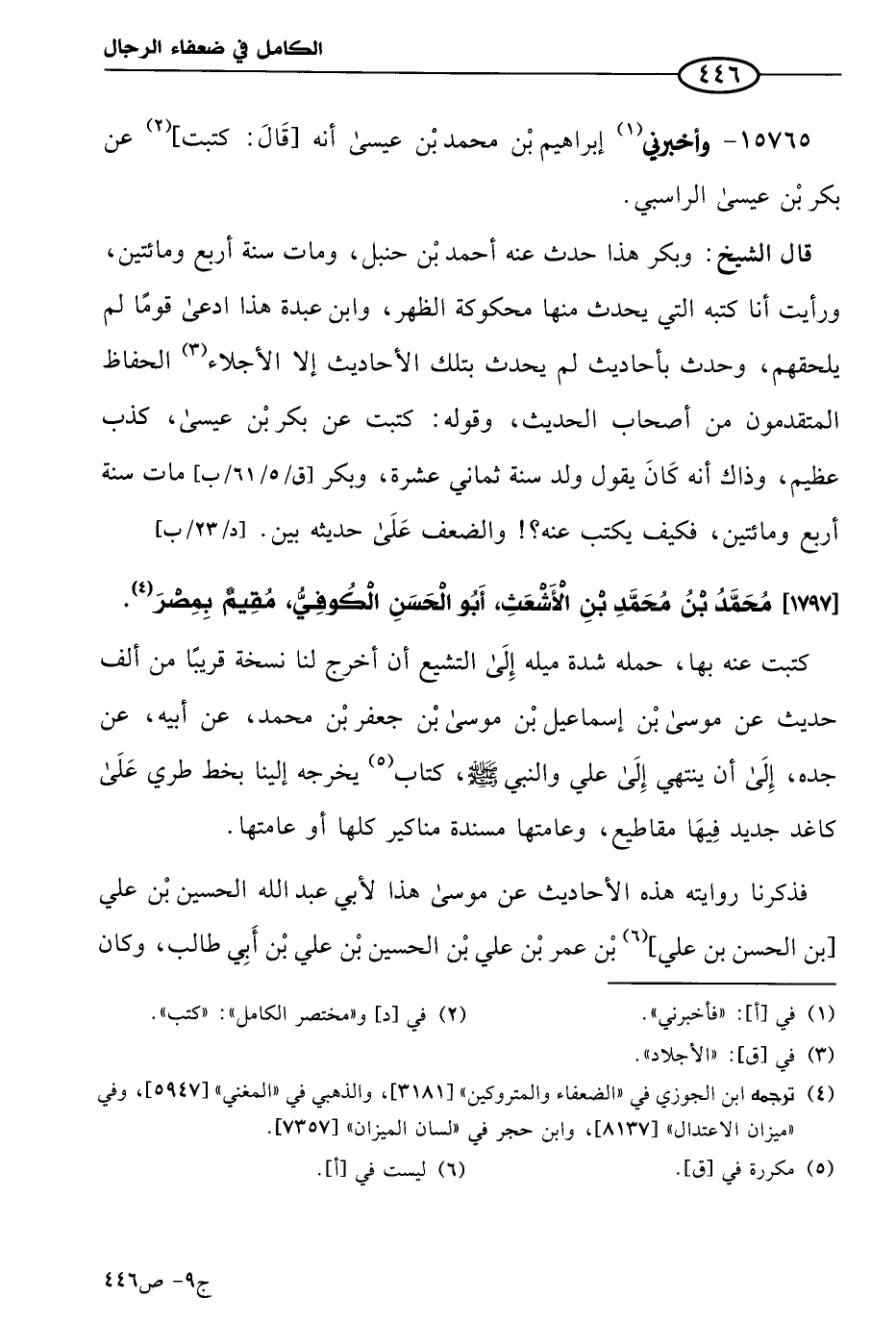 15765 - وأخبرني إبراهيم بن مُحمد بن عيسى عنه، أنه قال: كتبت عن بكر بن عيسى الراسبي.