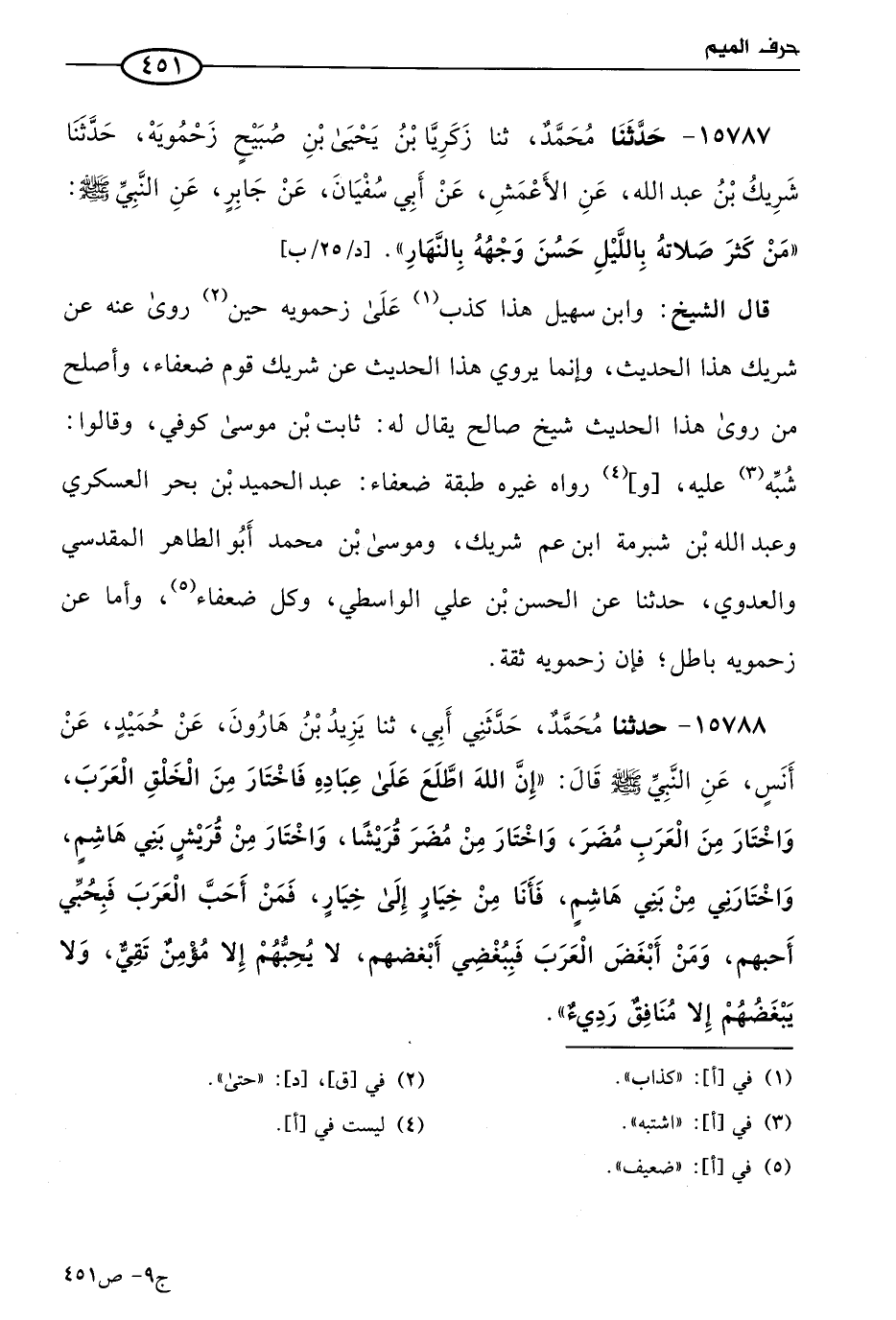 15787 - حَدثنا مُحمد، حَدثنا زكريا بن يَحيى بن صبيح زحمويه، حَدثنا شَريك بن عَبد الله، عن الأَعمَش، عن أبي سُفيان، عن جابر، عن النبي صَلى الله عَليه وسلم؛ من كثر صلاته بالليل، حسن وجهه بالنهار.