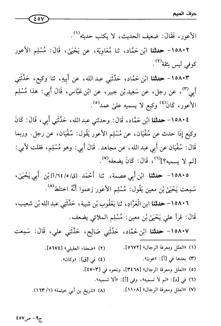 15806 - حَدثنا ابن العراد، حَدثنا يعقوب بن شيبة، حَدَّثني عَبد الله بن شُعَيب، قال: قرأ علي يَحيى بن مَعين: مسلم الملائي يضعف.