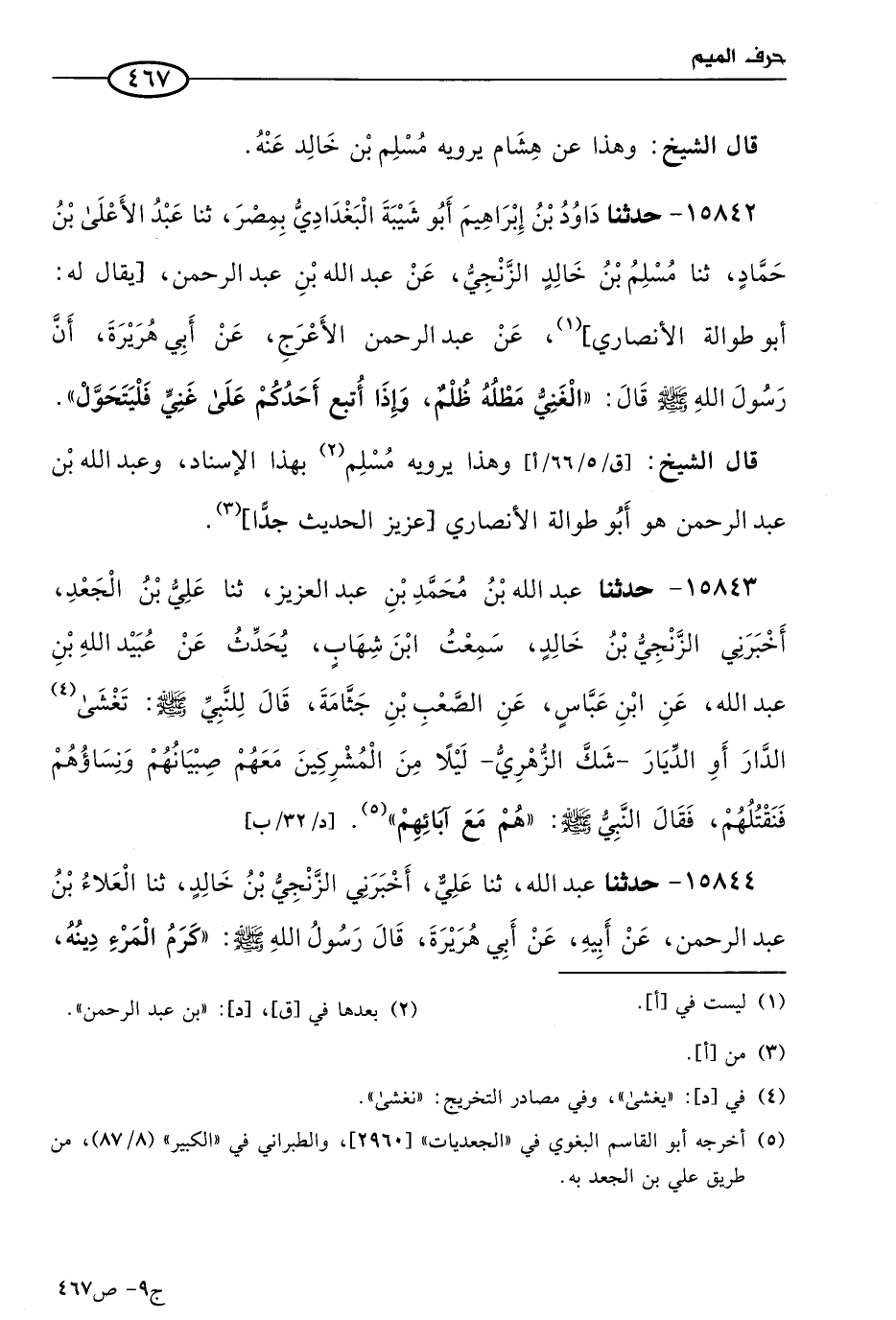 15842 - حَدثنا داود بن إبراهيم أَبو شيبة البغدادي بمصر، حَدثنا عَبد الأعلى بن حماد، حَدثنا مسلم بن خالد الزنجي، عن عَبد الله بن عَبد الرحمن (1)، عن عَبد الرحمن الأعرج، عن أبي هريرة؛ أن رسول الله صَلى الله عَليه وسَلم، قال: الغني مطله ظلم، وإذا اتَّبع أحدكم على غني فليتحول.