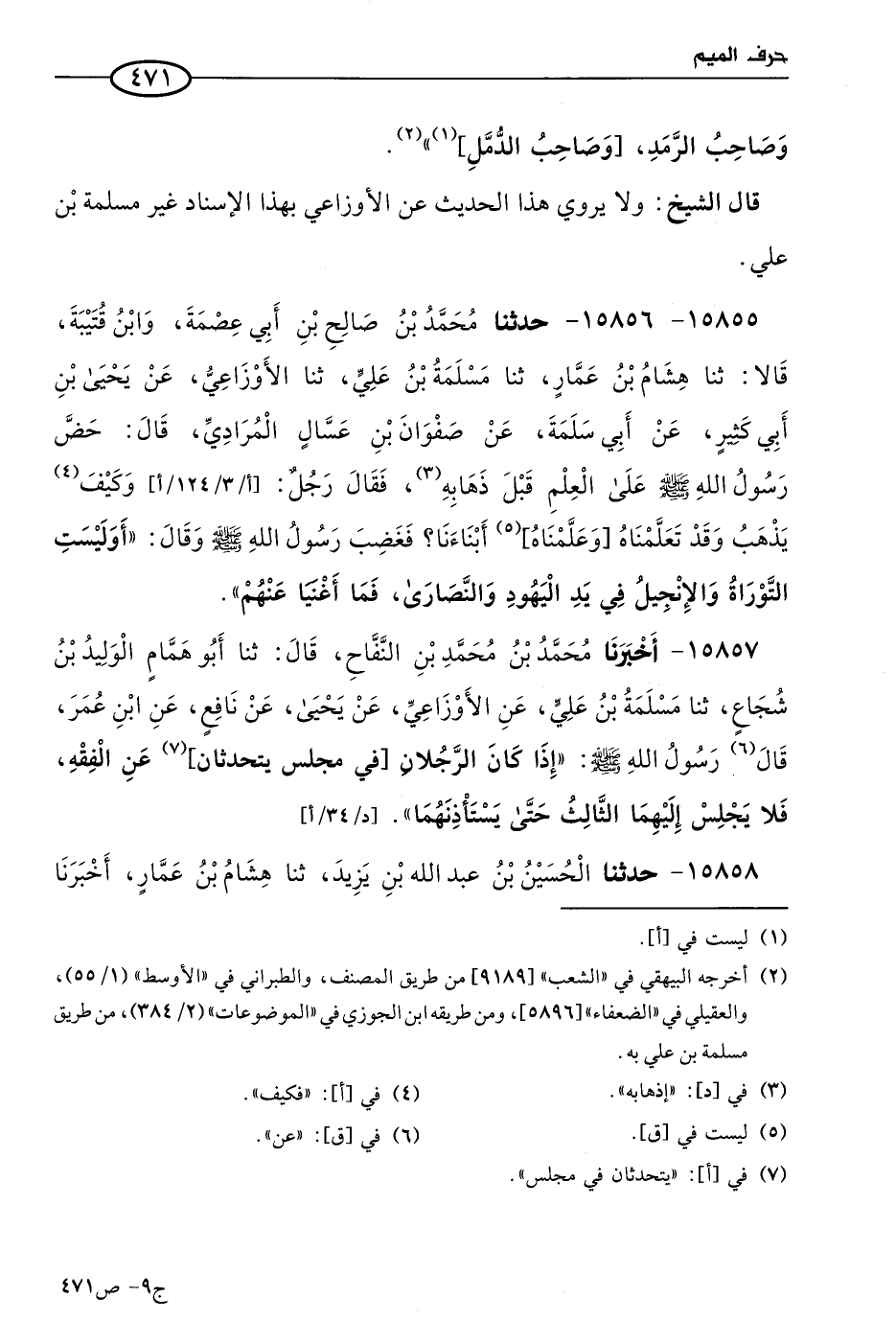 15855 - 15856 - حَدثنا مُحمد بن صالح بن أبي عصمة، وابن قتيبة، قالا: حَدثنا هشام بن عمار، حَدثنا مسلمة بن علي، حَدثنا الأَوزاعي، عن يَحيى بن أبي كثير، عن أبي سلمة، عن صفوان بن عسال المرادي، قال: حض رسول الله صَلى الله عَليه وسَلم على العلم قبل ذهابه، فقال رجل: وكيف يذهب وقد تعلمناه وعلمناه أبناءنا، فغضب رسول الله صَلى الله عَليه وسَلم، وقال: أوليست التوراة والإنجيل في يد اليهود والنصارى فما أغنيا عنهم.
