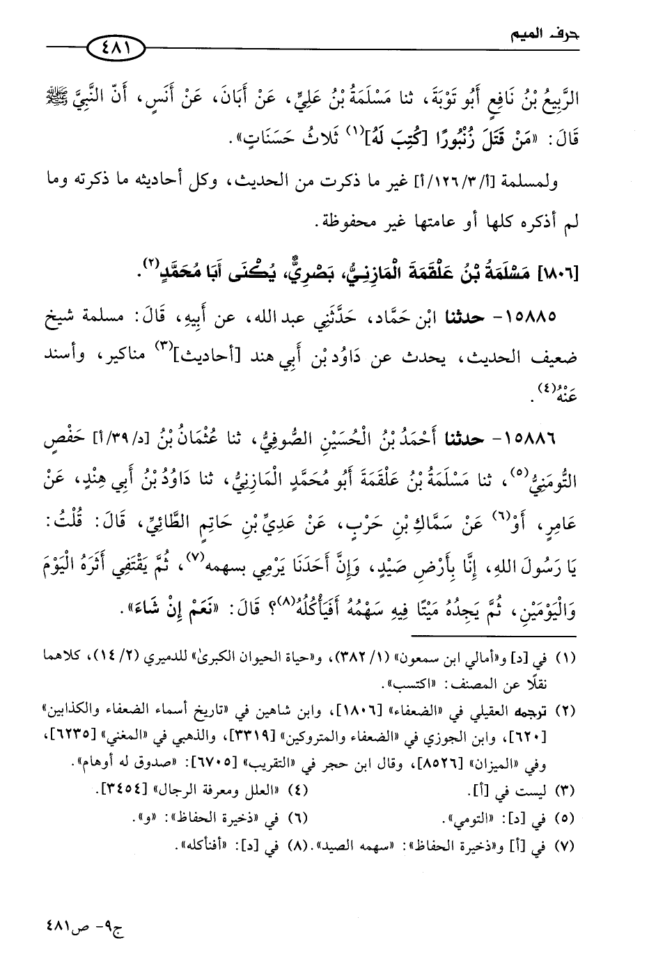 15885 - حَدثنا ابن حماد، حَدَّثني عَبد الله، عن أبيه، قال: مسلمة شيخ ضعيف الحديث، يحدث عن داود بن أبي هند أحاديث مناكير، وأسند عنه.