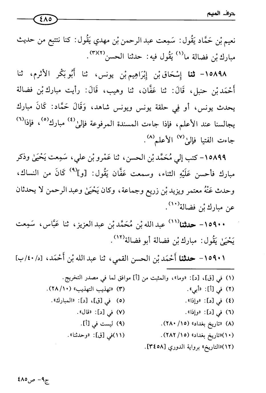 15901 - حَدثنا أحمد بن الحسن القمي، حَدثنا عَبد الله بن أحمد، سألتُ يَحيى بن مَعين، عن مبارك بن فضالة، فقال: ضَعيف الحديث.
