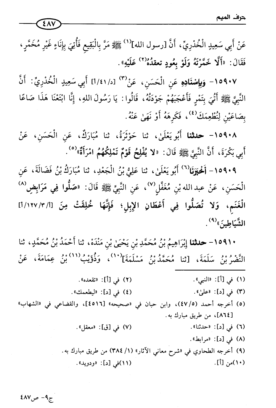 15909 - أخبرنا أَبو يَعلَى، حَدثنا علي بن الجعد، حَدثنا مبارك بن فضالة، عن الحسن، عن عَبد الله بن مغفل، عن النبي صَلى الله عَليه وسَلم، قال: صلوا في مرابض الغنم، ولا تصلوا في أعطان الإبل، فإنها خلقت من الشياطين.