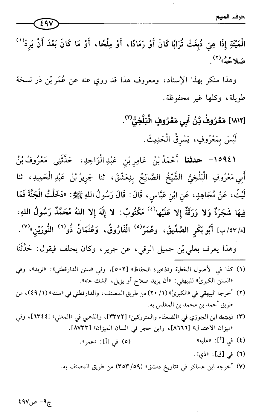 15941 - حَدثنا أحمد بن عامر بن عَبد الواحد، حَدَّثني معروف بن أبي معروف البلخي، الشيخ الصالح بدمشق، حَدثنا جرير بن عَبد الحميد، حَدثنا لَيث، عن مجاهد، عن ابن عباس، قال: قال رسول الله صَلى الله عَليه وسَلم: دخلت الجنة، فما فيها شجرة ولا ورقة، إلا عليها مكتوب: لا إله إلا الله مُحمد رسول الله، أَبو بكر الصديق، وعُمر الفاروق، وعثمان ذو النورين.
