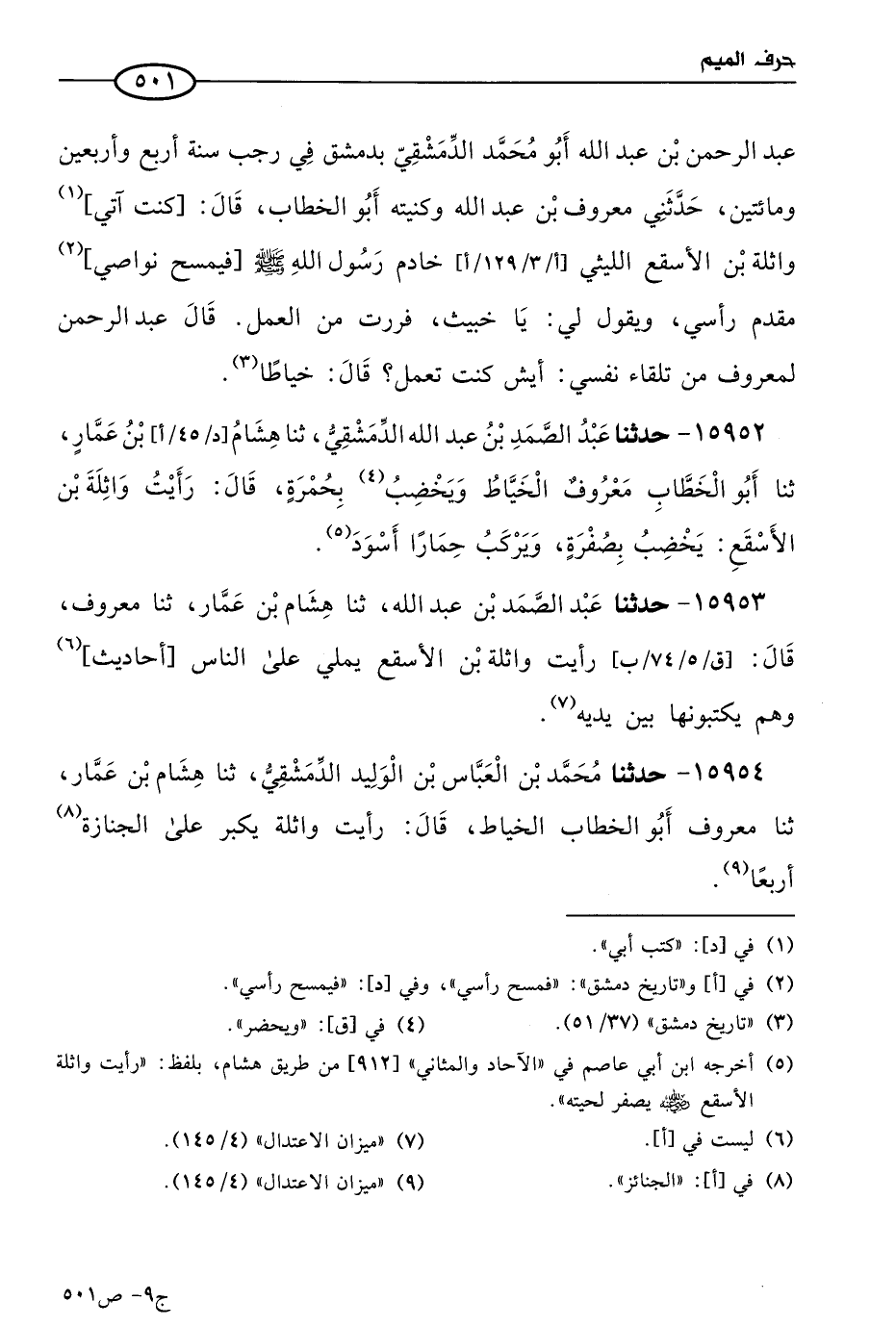 15953 - حَدثنا عَبد الصمد بن عَبد الله، حَدثنا هشام بن عمار، حَدثنا معروف، قال: رأيتُ واثلة بن الأسقع يملي على الناس أحاديث وهم يكتبونها بين يديه.