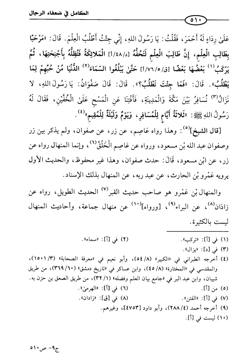 قال الشيخ: وهذا رواه عاصم، عن زر، عن صفوان، ولم يذكر بين زر وصفوان: عَبد الله بن مسعود، ورواه عن عاصم الخلق، وإِنما المنهال رواه عن زر، عن ابن مسعود، قال: حدث صفوان، وهذا غير محفوظ، والحديث الأول يرويه عَمرو بن الحارث، عن عَبد رَبِّهِ، عن المنهال بذلك الإسناد.