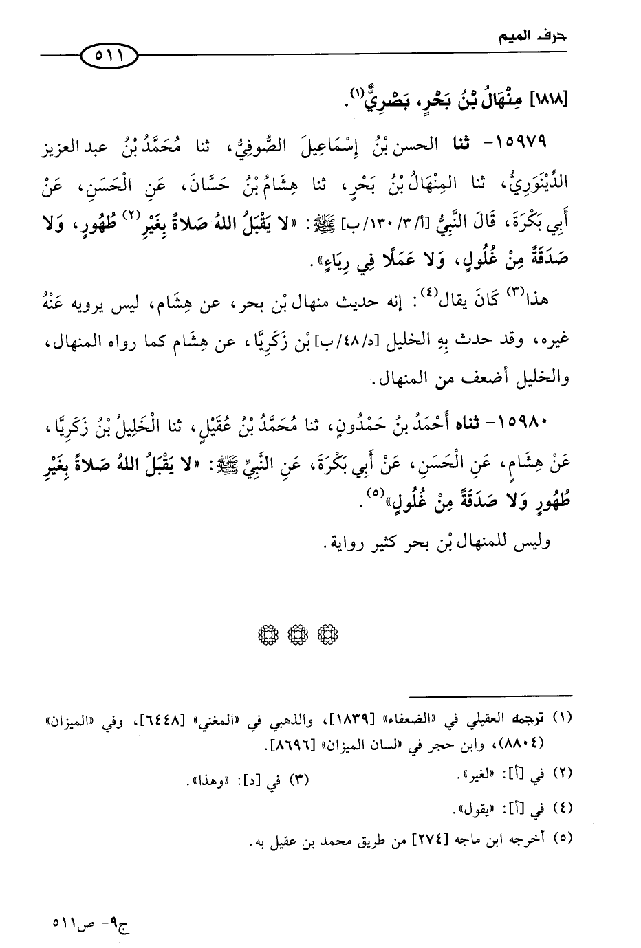 15980 - حَدثناهُ أحمد بن حمدون، حَدثنا مُحمد بن عقيل، حَدثنا الخليل بن زكريا، عن هِشام، عن الحسن، عن أبي بكرة، عن النبي صَلى الله عَليه وسلم؛ لا يقبل الله صلاة بغير طهور، ولا صدقة من غلول.