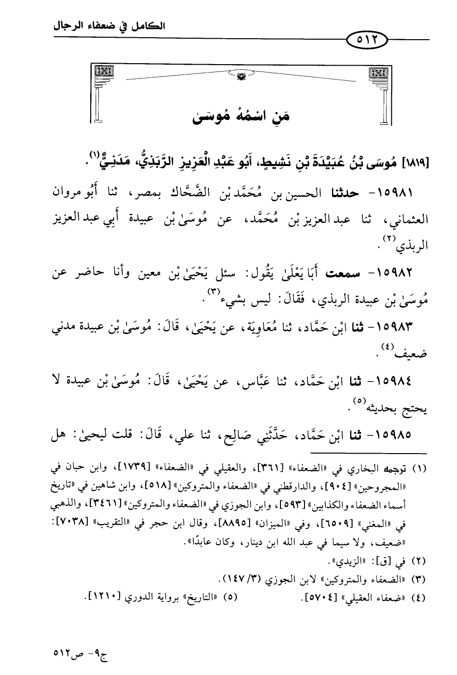 15983 - حَدثنا ابن حماد، حَدثنا معاوية، عن يَحيى، قال: موسى بن عبيدة مدني ضعيف.