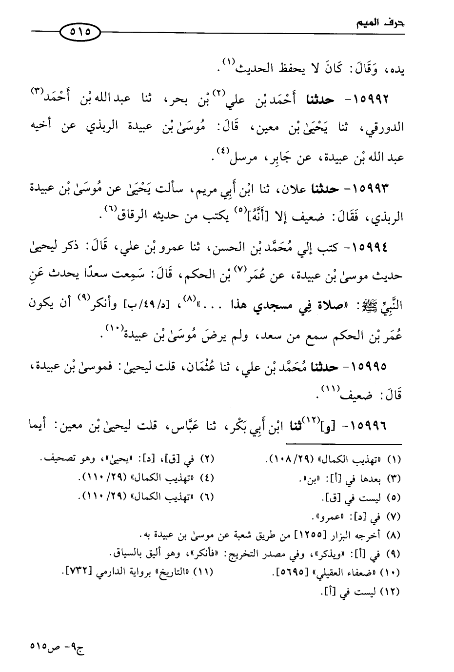 15995 - حَدثنا مُحمد بن علي، حَدثنا عثمان، قلت ليحيى: فموسى بن عبيدة؟ قال: ضعيف.