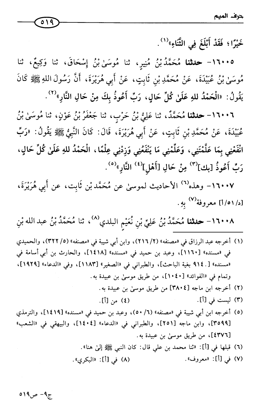 16005 - حَدثنا مُحمد بن منير، حَدثنا موسى بن إسحاق، حَدثنا وكيع، حَدثنا موسى بن عبيدة، عن مُحمد بن ثابت، عن أبي هريرة؛ أن رسول الله صَلى الله عَليه وسَلم كان يقول: الحمد لله على كل حال، رب أعوذ بك من حال النار.