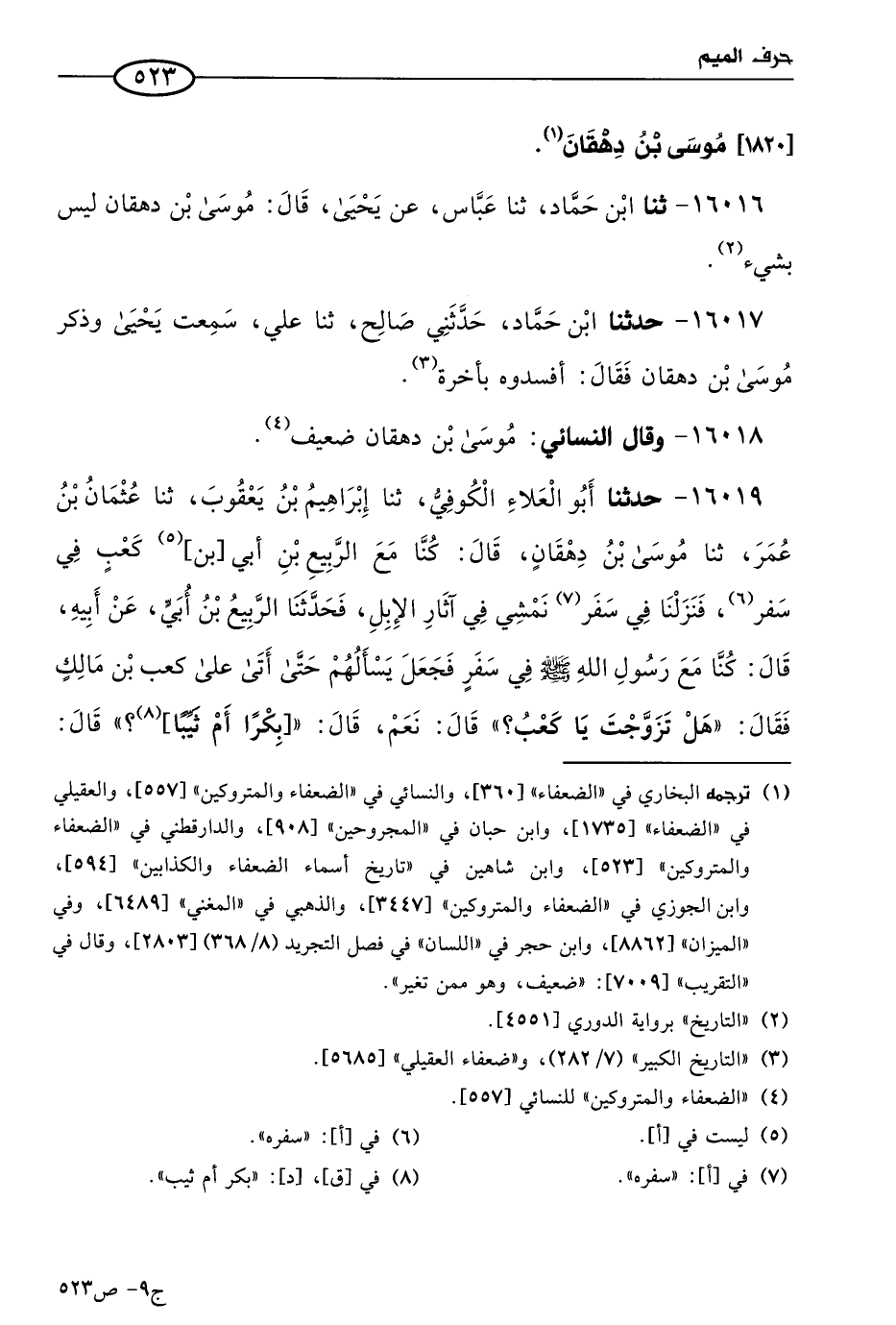 16018 - وقال النسائي: موسى بن دهقان ضعيف.